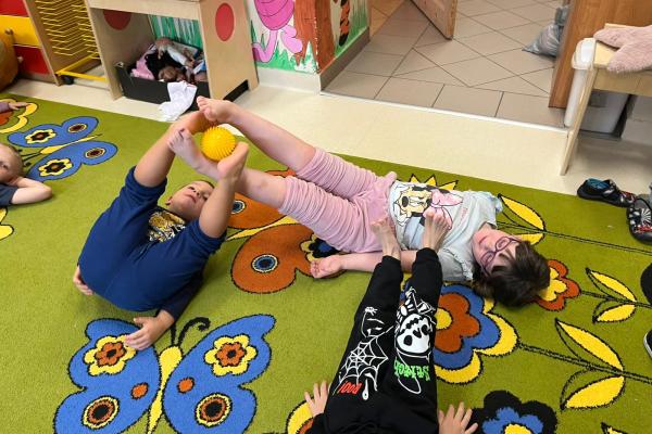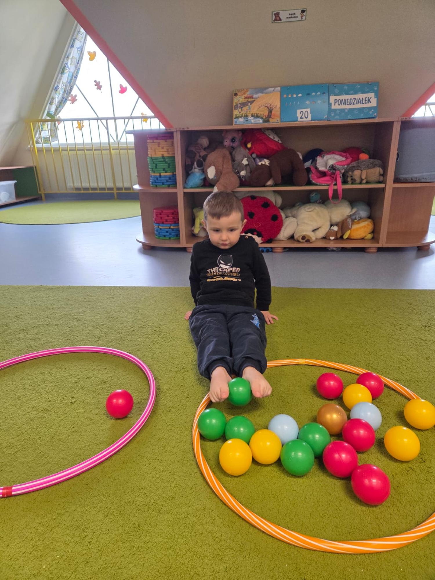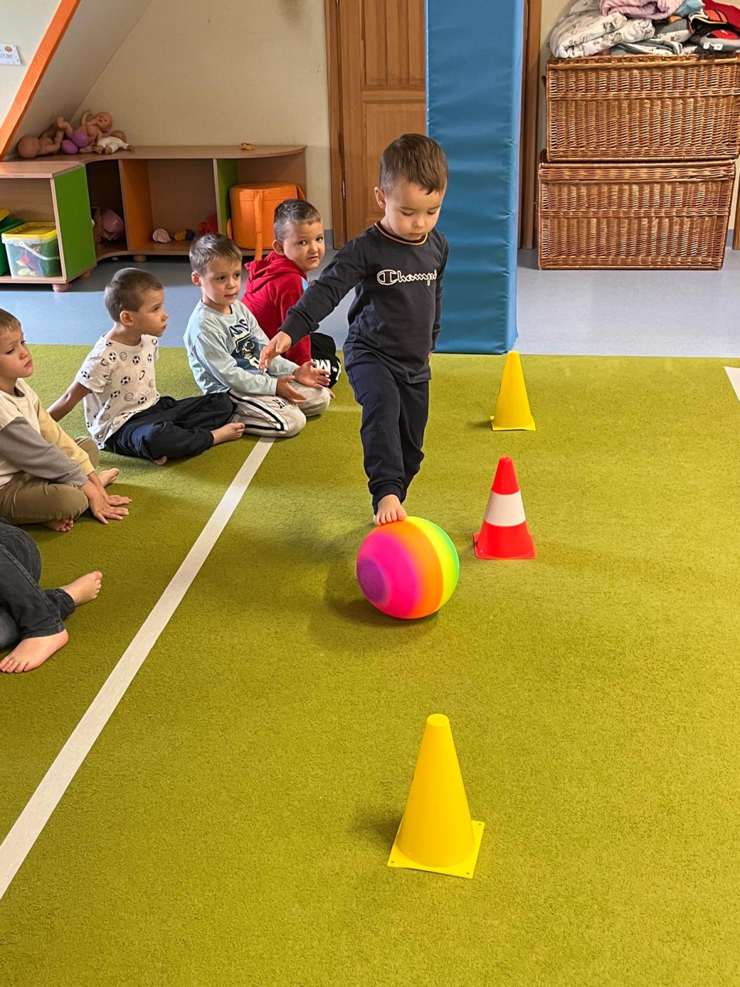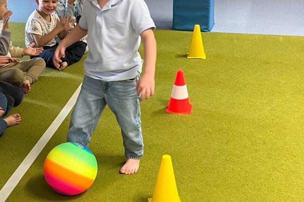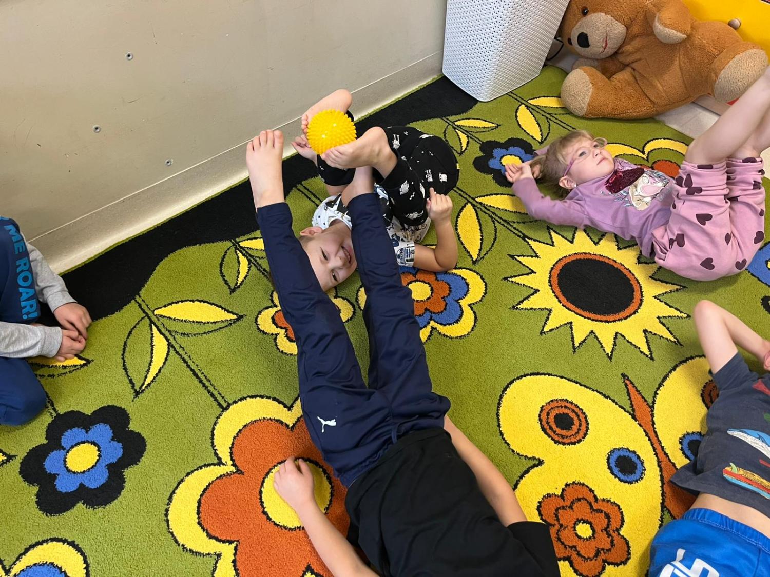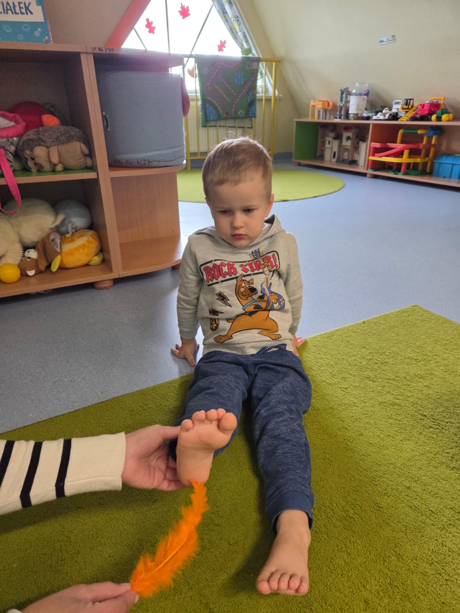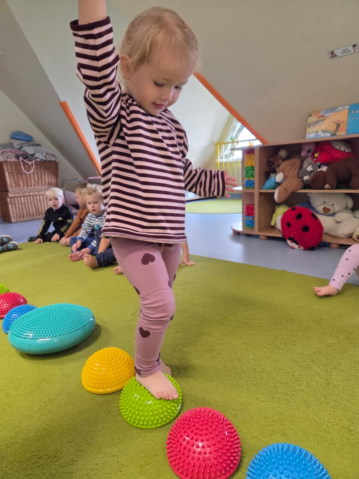 Na przedszkolaków czekała ścieżka sensoryczna, po której mogły przechodzić boso, odkrywając różne faktury – miękkie i szorstkie, chłodne i ciepłe. Dzieci uczestniczyły również w zabawie z piłkami. Każdy krok był nowym doświadczeniem, które nie tylko dostarczało radości, ale też wspierało rozwój równowagi i koordynacji.