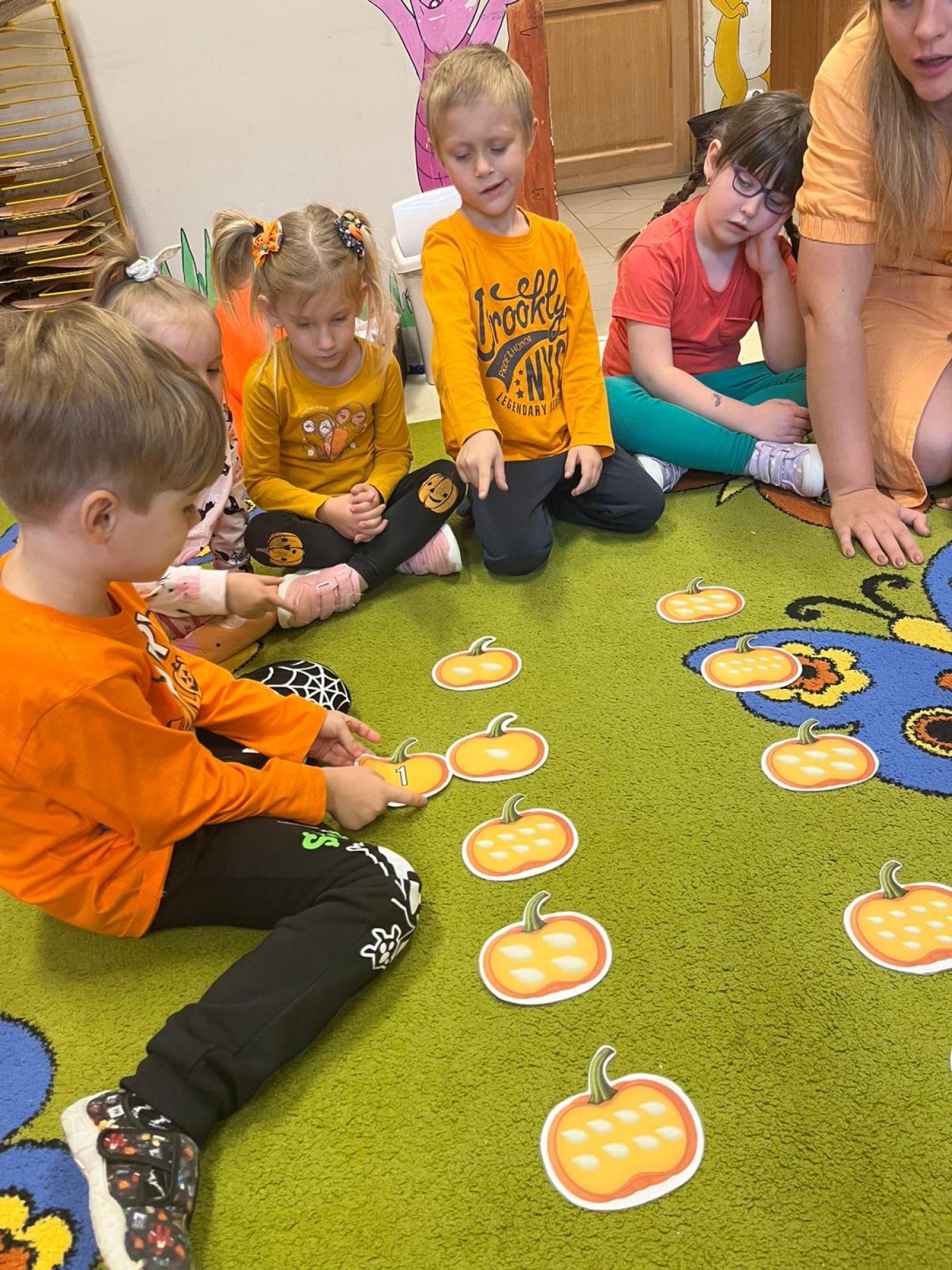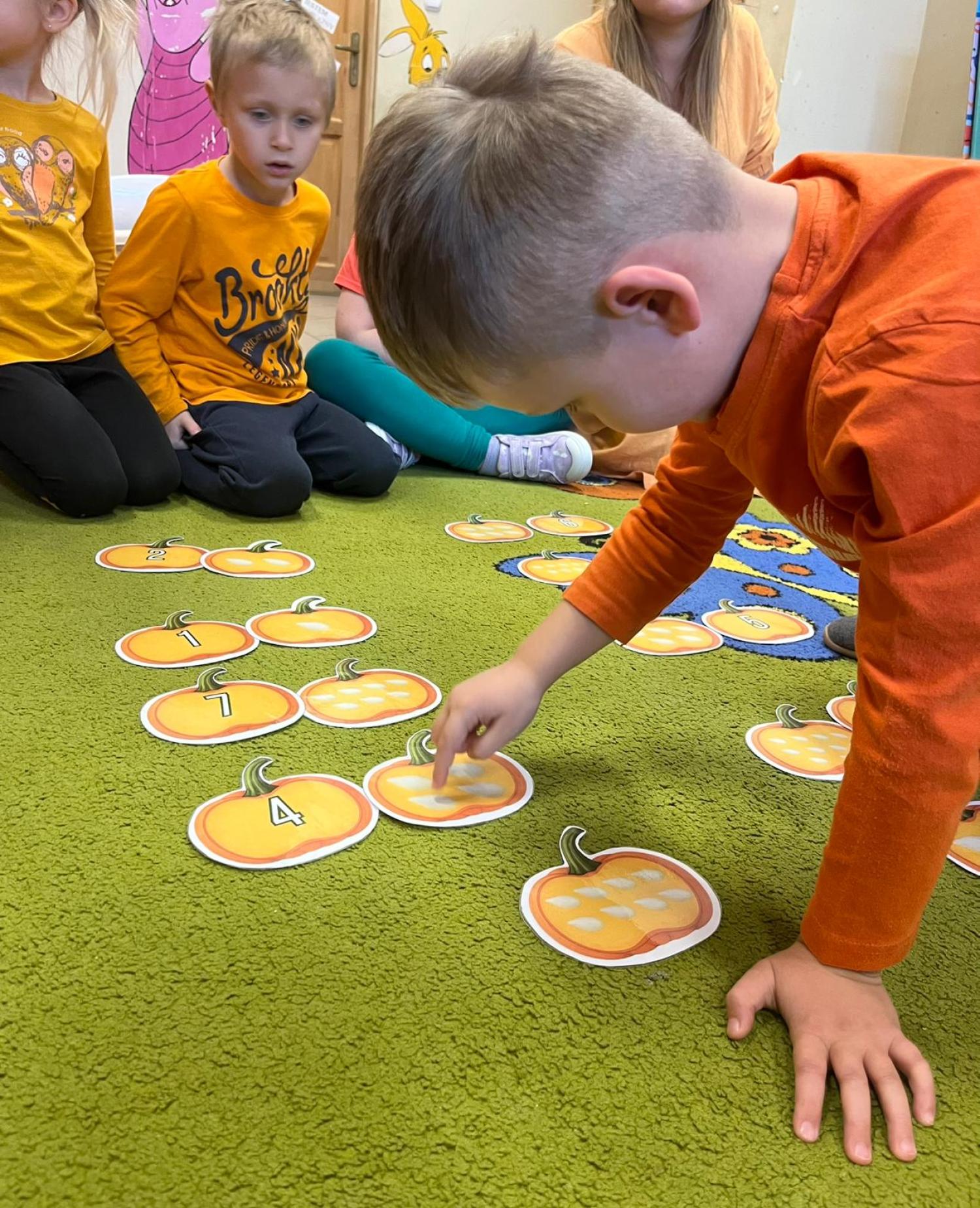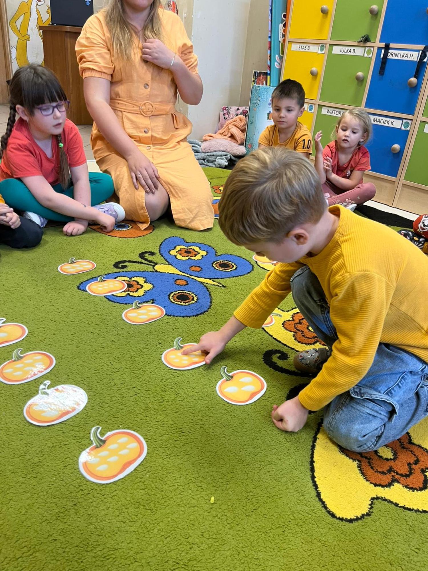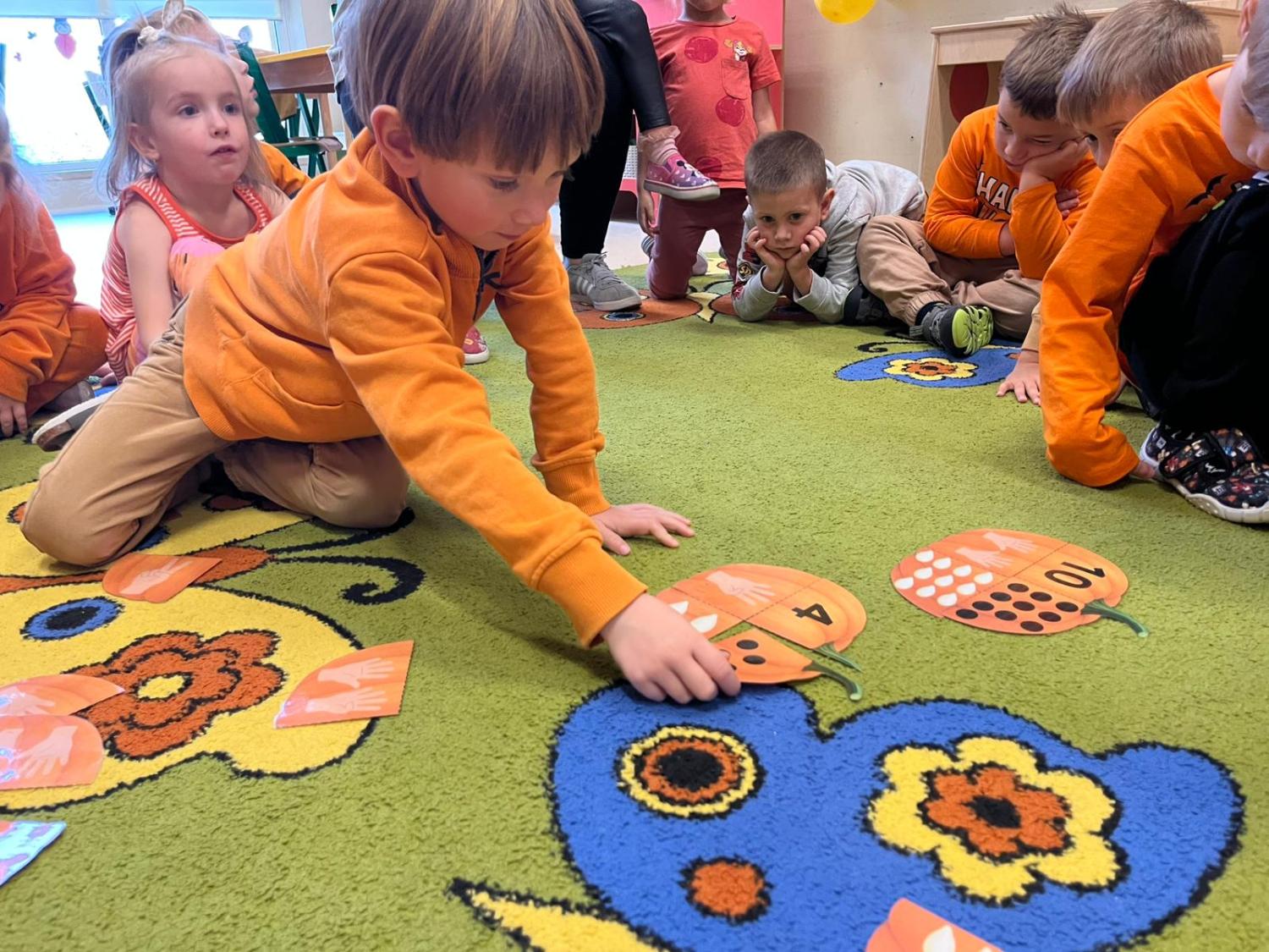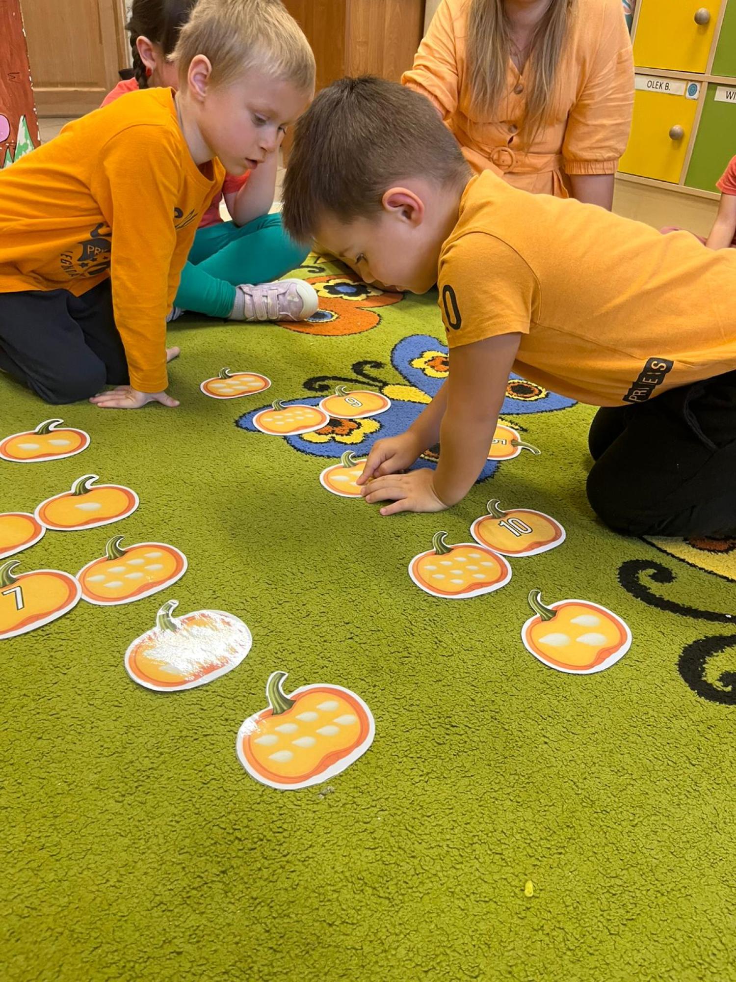 Nie zabrakło również zabaw edukacyjnych. Przedszkolaki przeliczały dyniowe pestki, dopasowywały liczby do odpowiednich ilości, a także układały dyniowe puzzle, ćwicząc przy tym spostrzegawczość i logiczne myślenie. Podczas zabaw dzieci utrwalały również określenia położenia przedmiotów na rysunku i względem własnego ciała, co dostarczyło im wiele radości i ruchu.