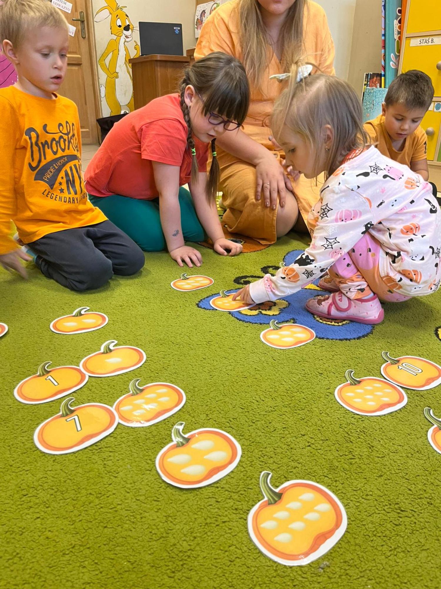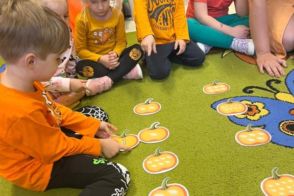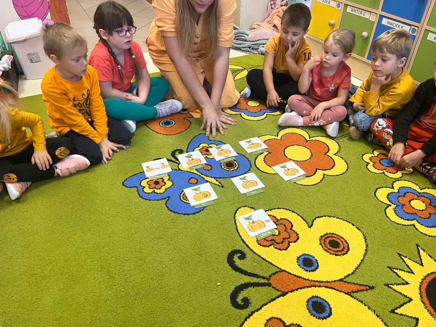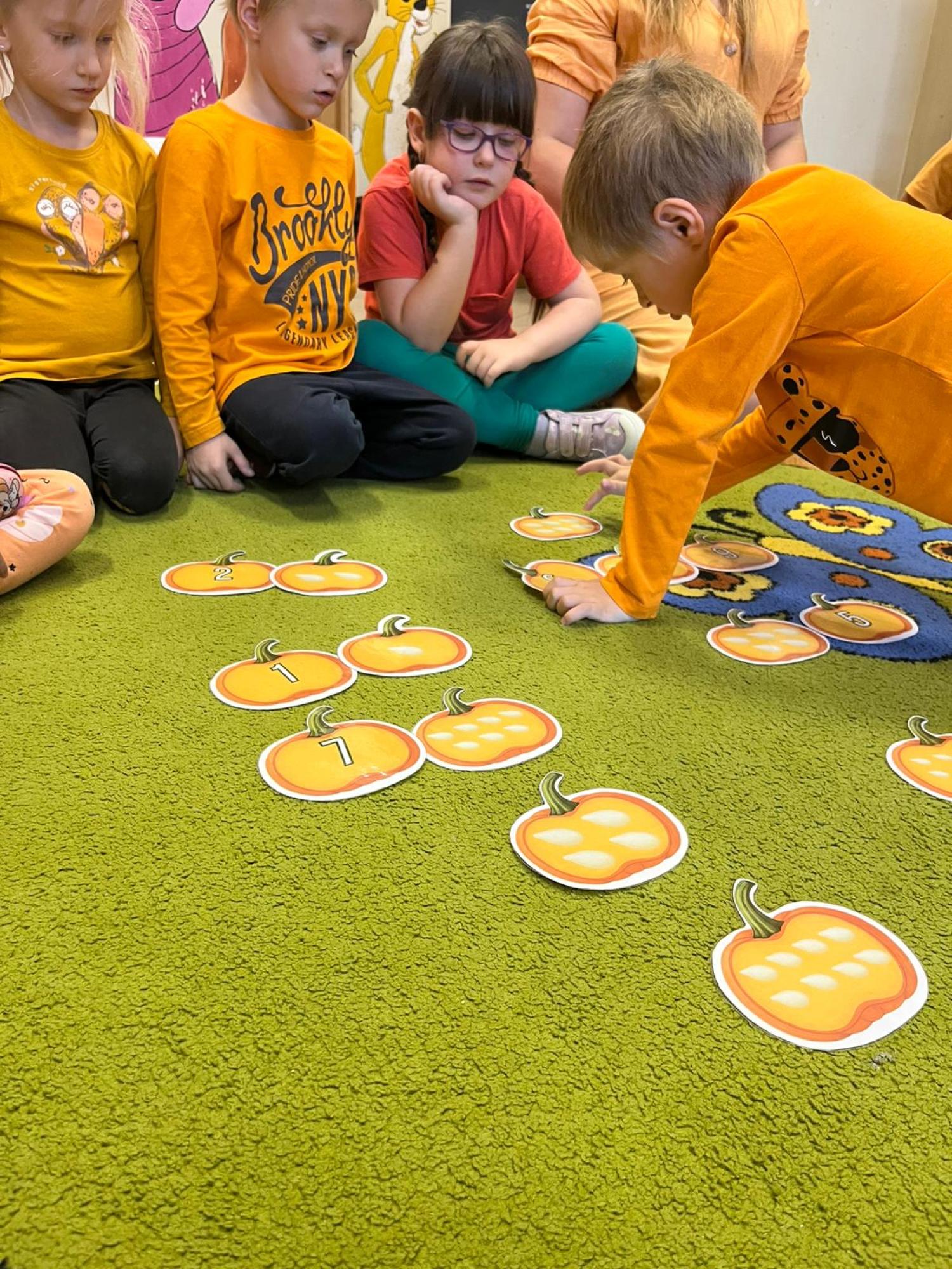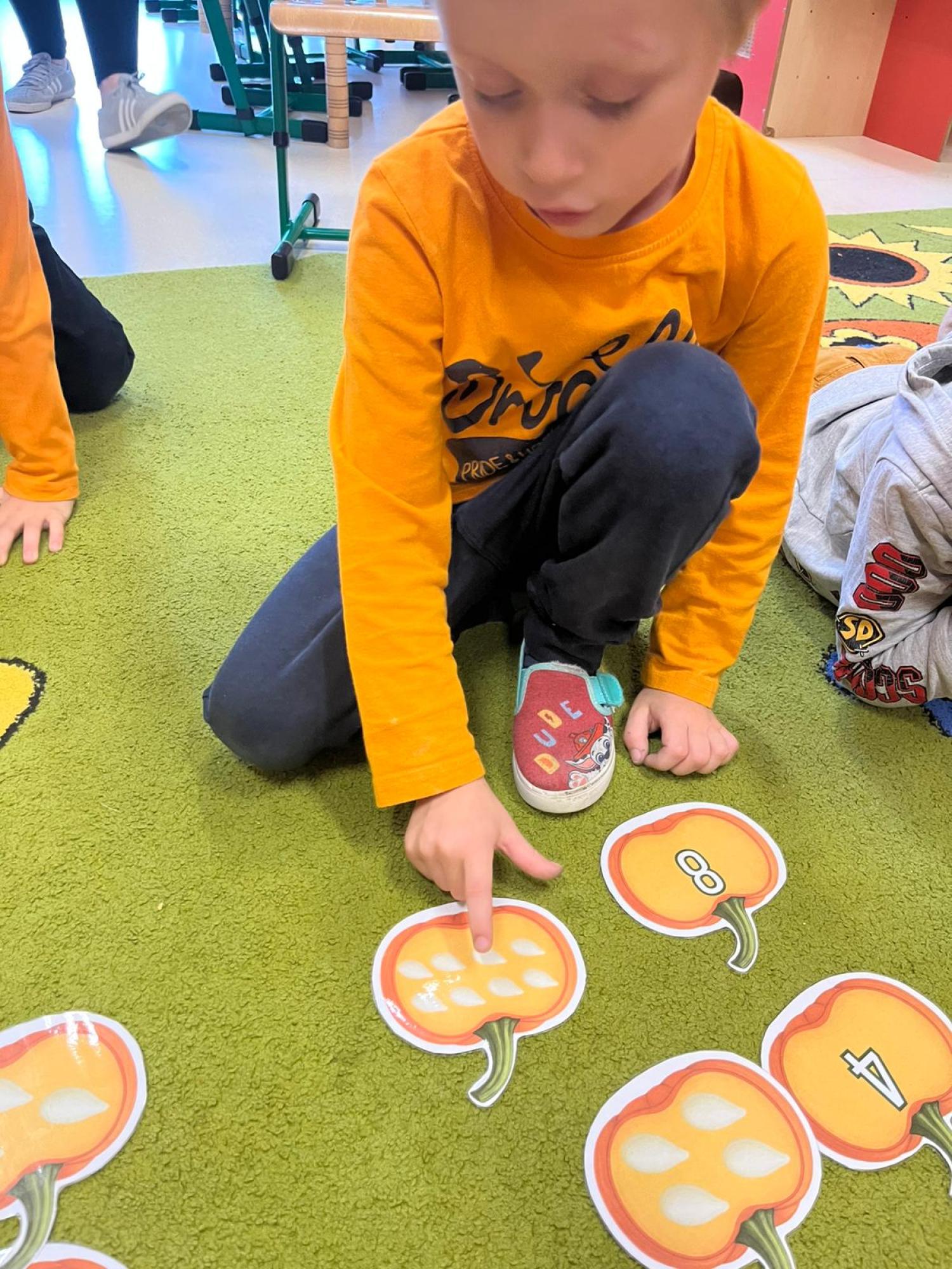 Nie zabrakło również zabaw edukacyjnych. Przedszkolaki przeliczały dyniowe pestki, dopasowywały liczby do odpowiednich ilości, a także układały dyniowe puzzle, ćwicząc przy tym spostrzegawczość i logiczne myślenie. Podczas zabaw dzieci utrwalały również określenia położenia przedmiotów na rysunku i względem własnego ciała, co dostarczyło im wiele radości i ruchu.