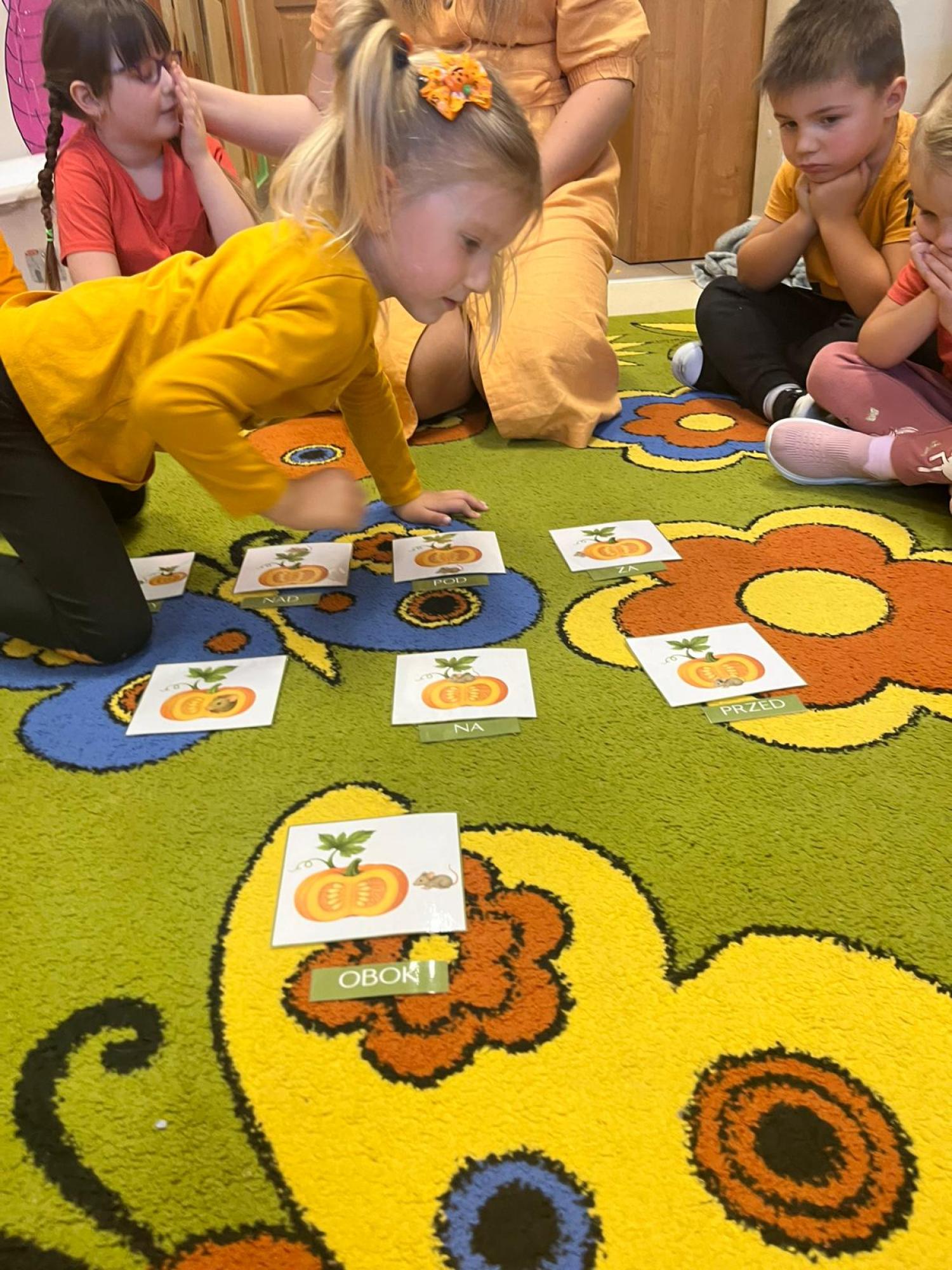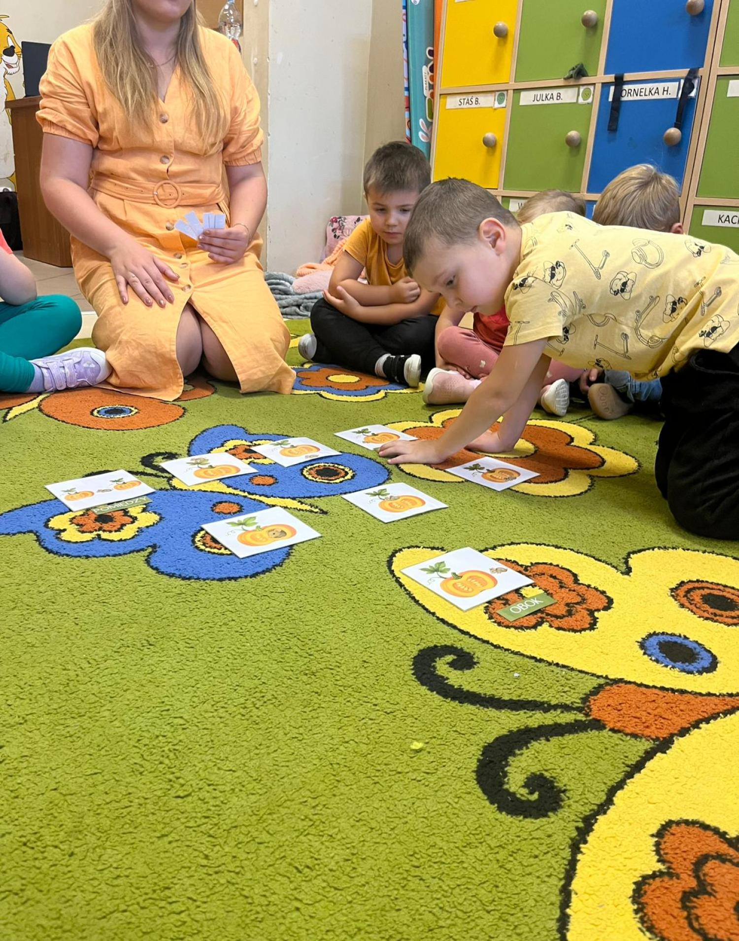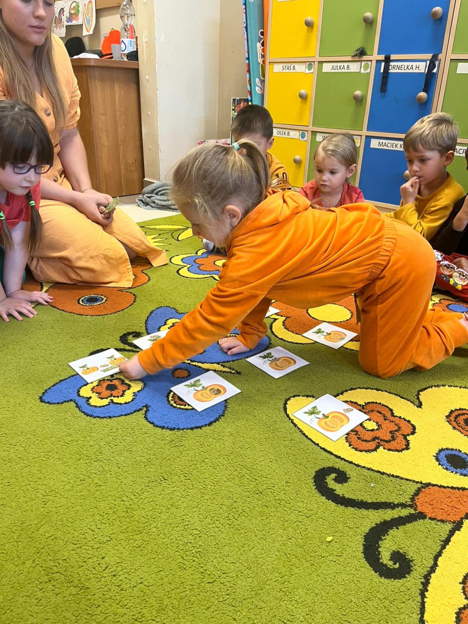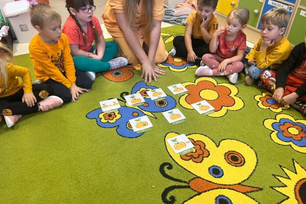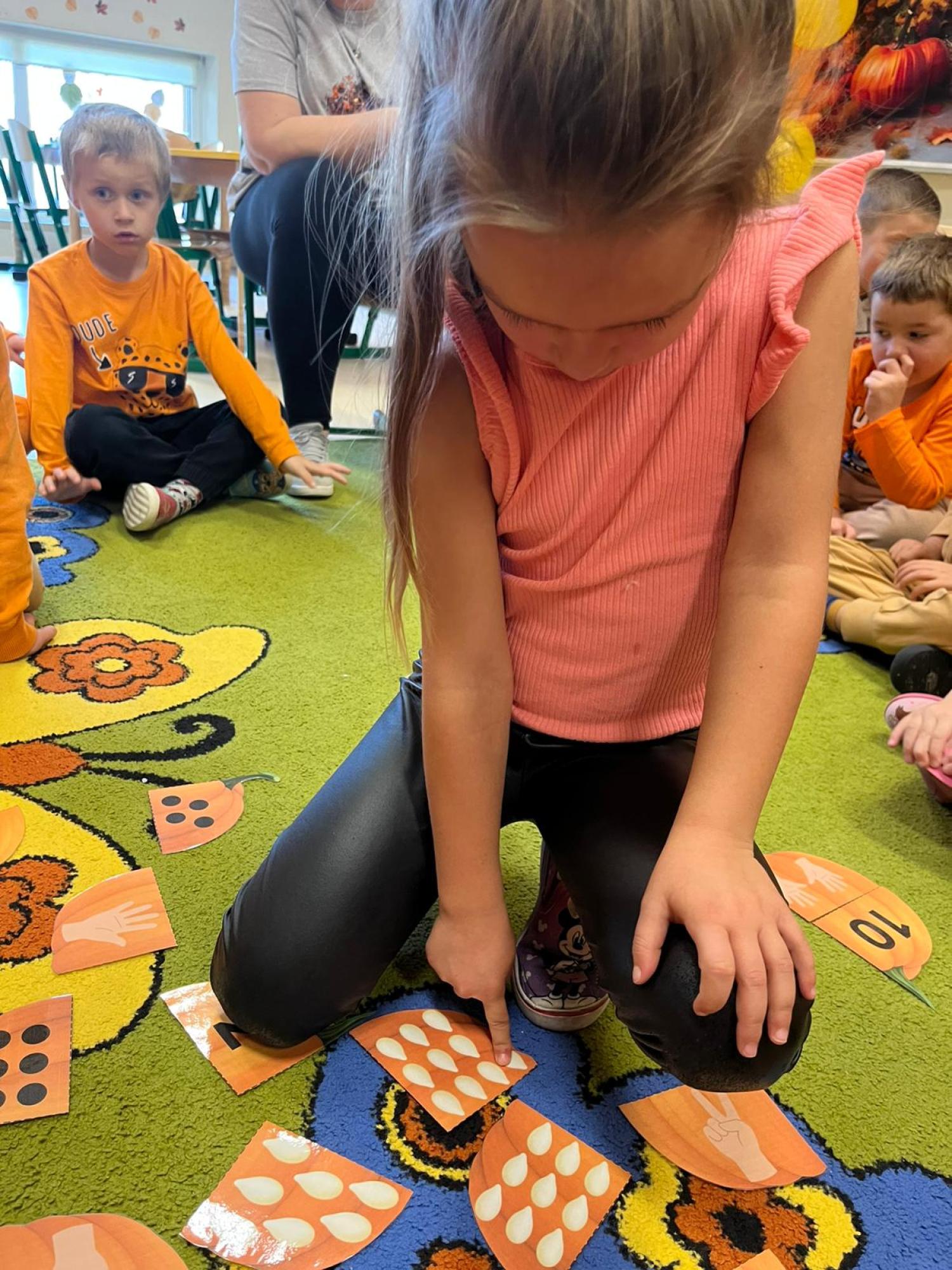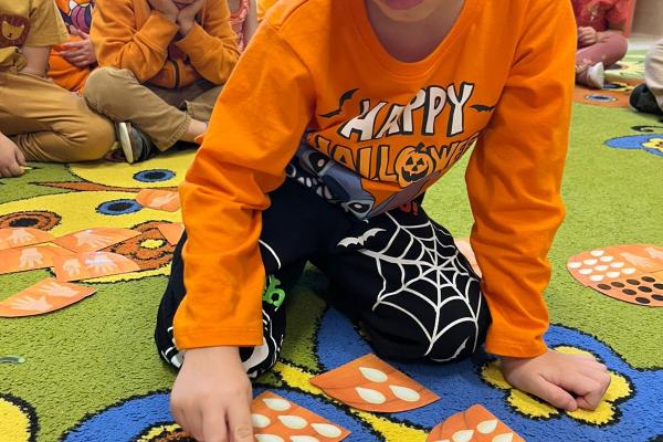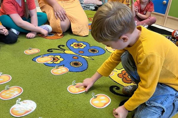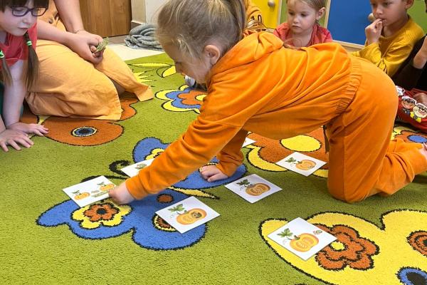 Nie zabrakło również zabaw edukacyjnych. Przedszkolaki przeliczały dyniowe pestki, dopasowywały liczby do odpowiednich ilości, a także układały dyniowe puzzle, ćwicząc przy tym spostrzegawczość i logiczne myślenie. Podczas zabaw dzieci utrwalały również określenia położenia przedmiotów na rysunku i względem własnego ciała, co dostarczyło im wiele radości i ruchu.