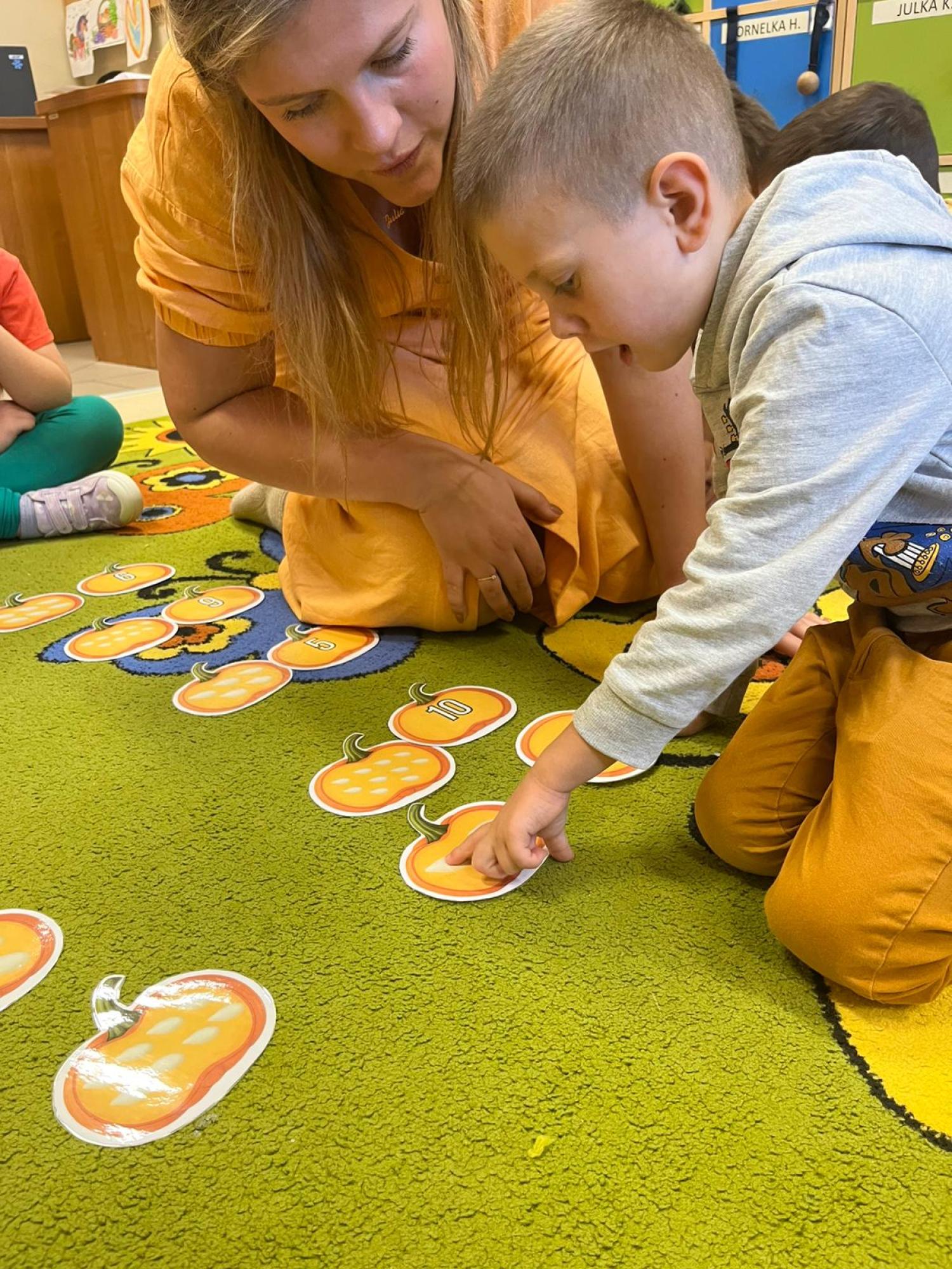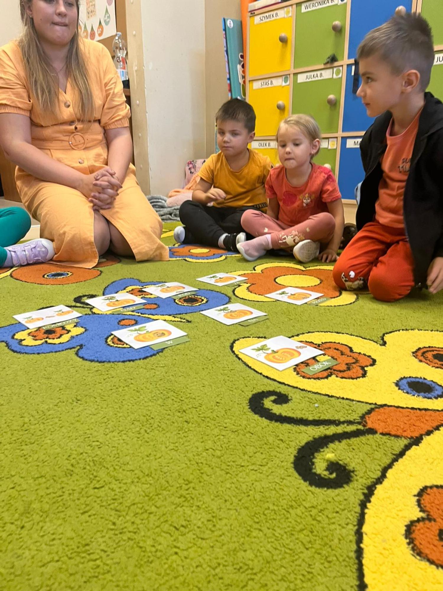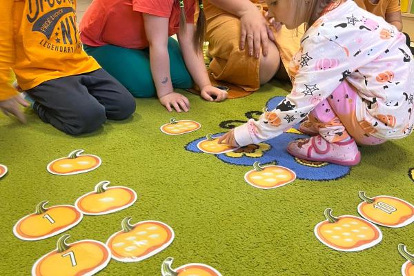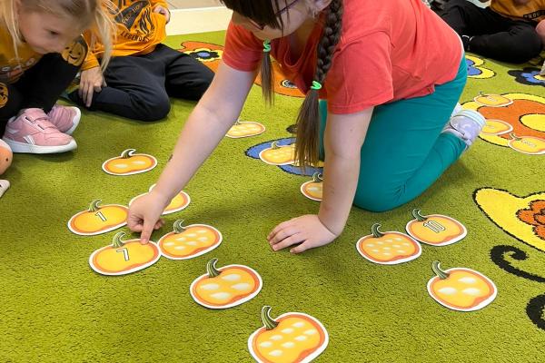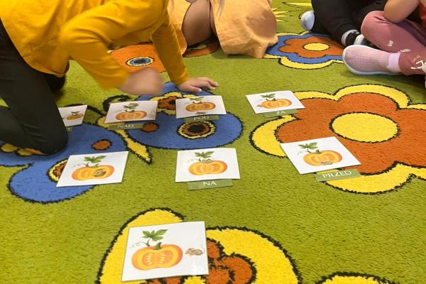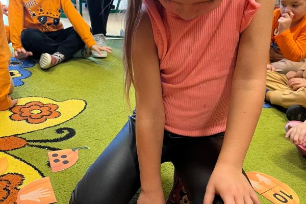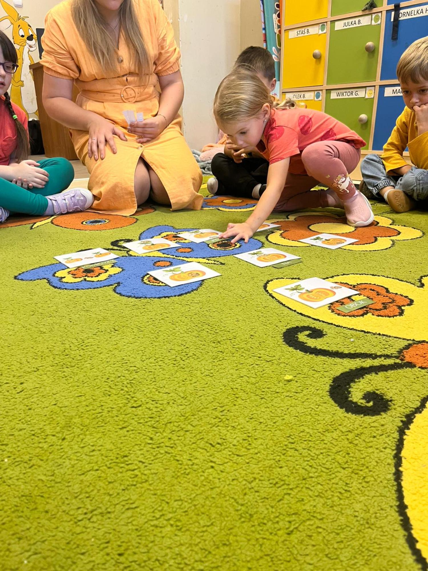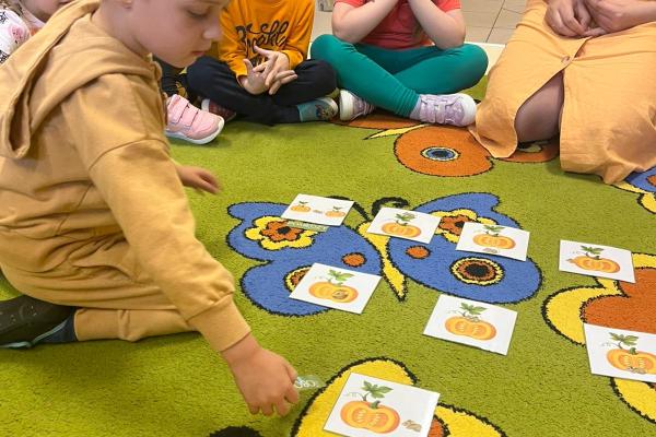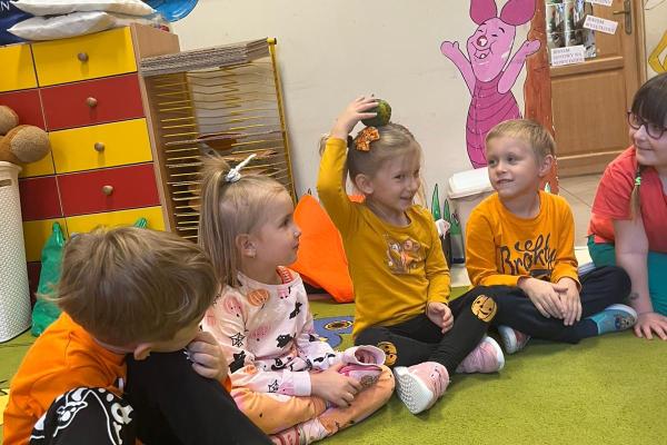 Nie zabrakło również zabaw edukacyjnych. Przedszkolaki przeliczały dyniowe pestki, dopasowywały liczby do odpowiednich ilości, a także układały dyniowe puzzle, ćwicząc przy tym spostrzegawczość i logiczne myślenie. Podczas zabaw dzieci utrwalały również określenia położenia przedmiotów na rysunku i względem własnego ciała, co dostarczyło im wiele radości i ruchu.