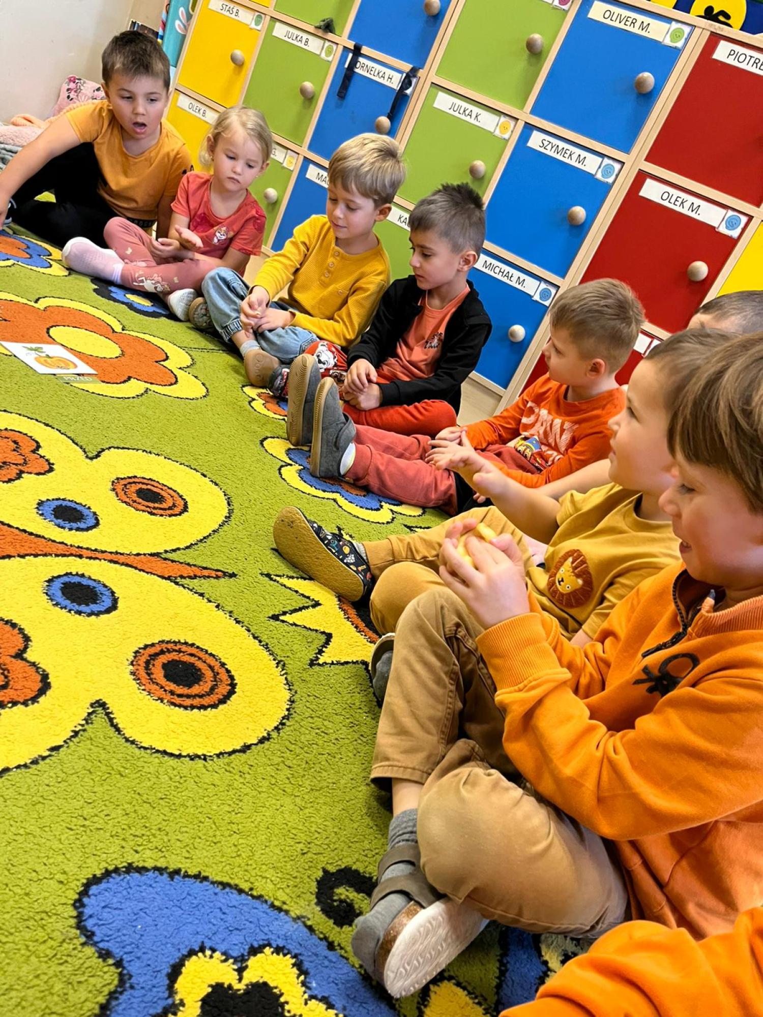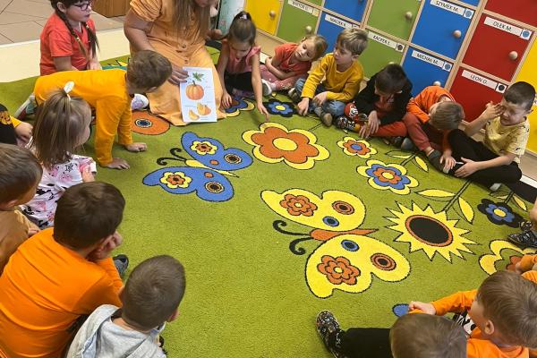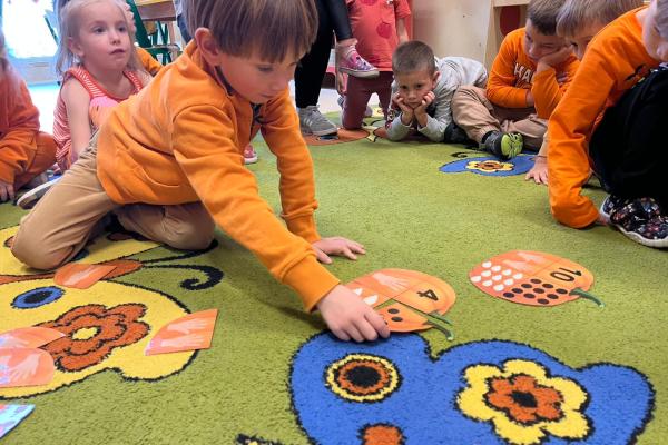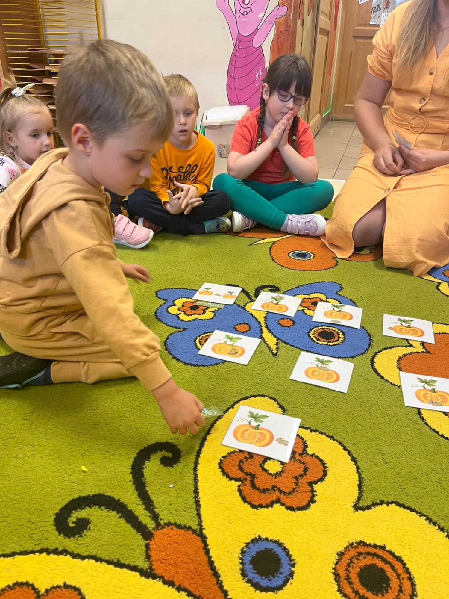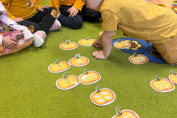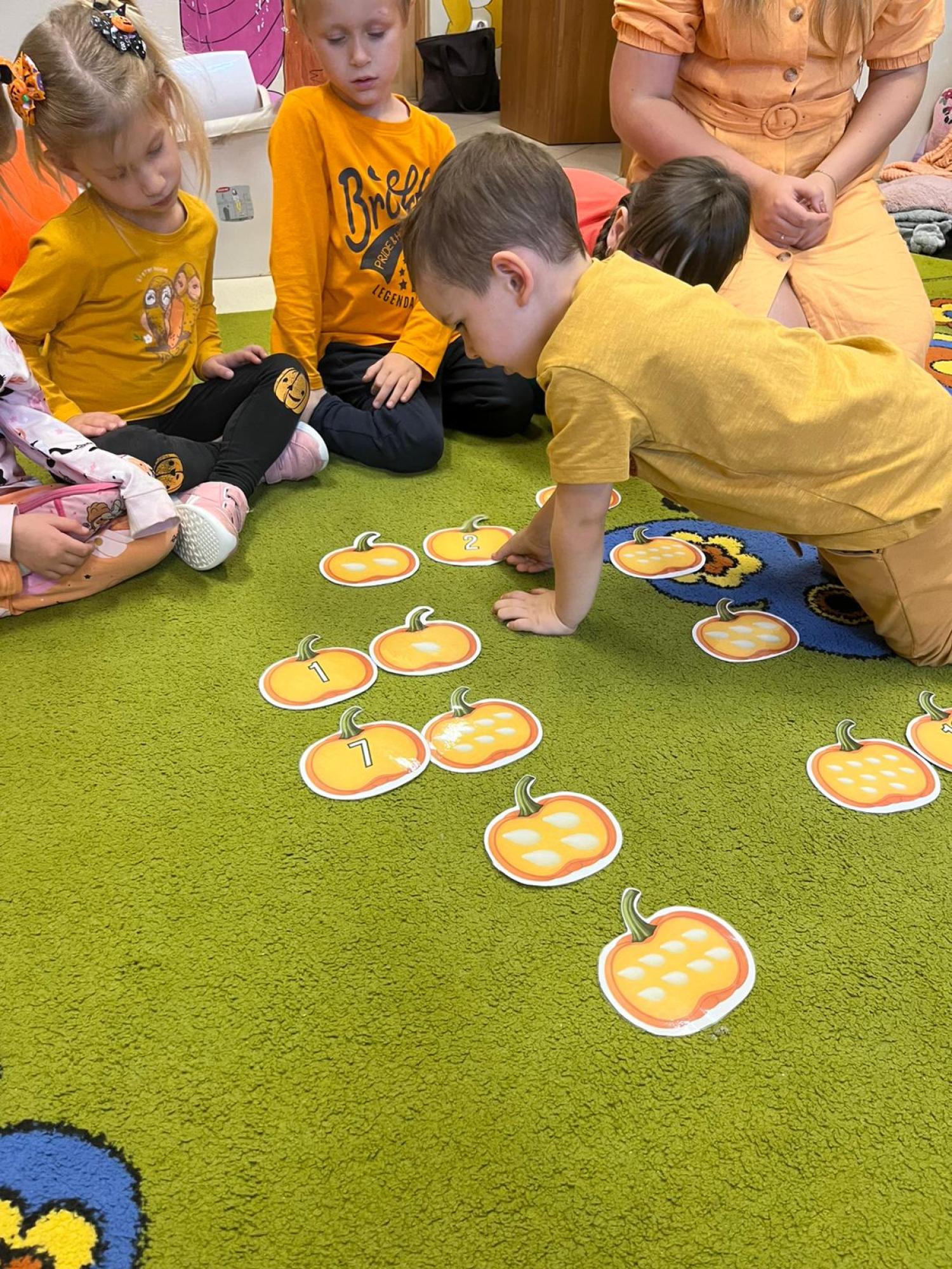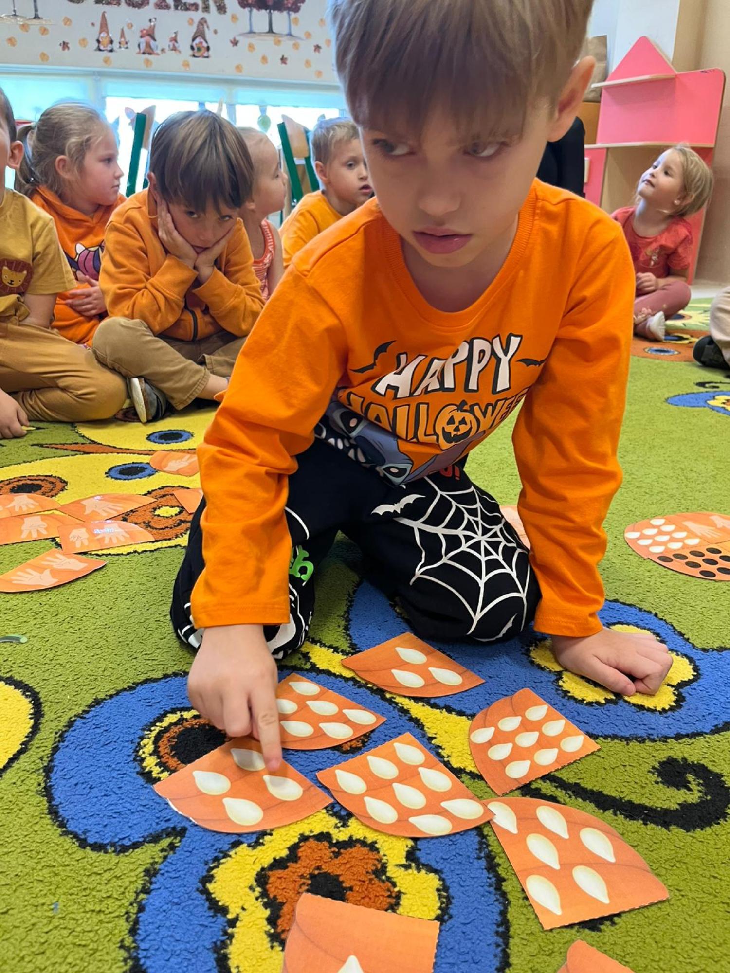 Nie zabrakło również zabaw edukacyjnych. Przedszkolaki przeliczały dyniowe pestki, dopasowywały liczby do odpowiednich ilości, a także układały dyniowe puzzle, ćwicząc przy tym spostrzegawczość i logiczne myślenie. Podczas zabaw dzieci utrwalały również określenia położenia przedmiotów na rysunku i względem własnego ciała, co dostarczyło im wiele radości i ruchu.