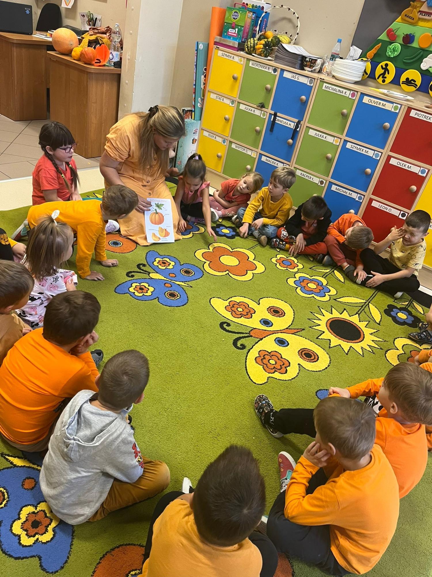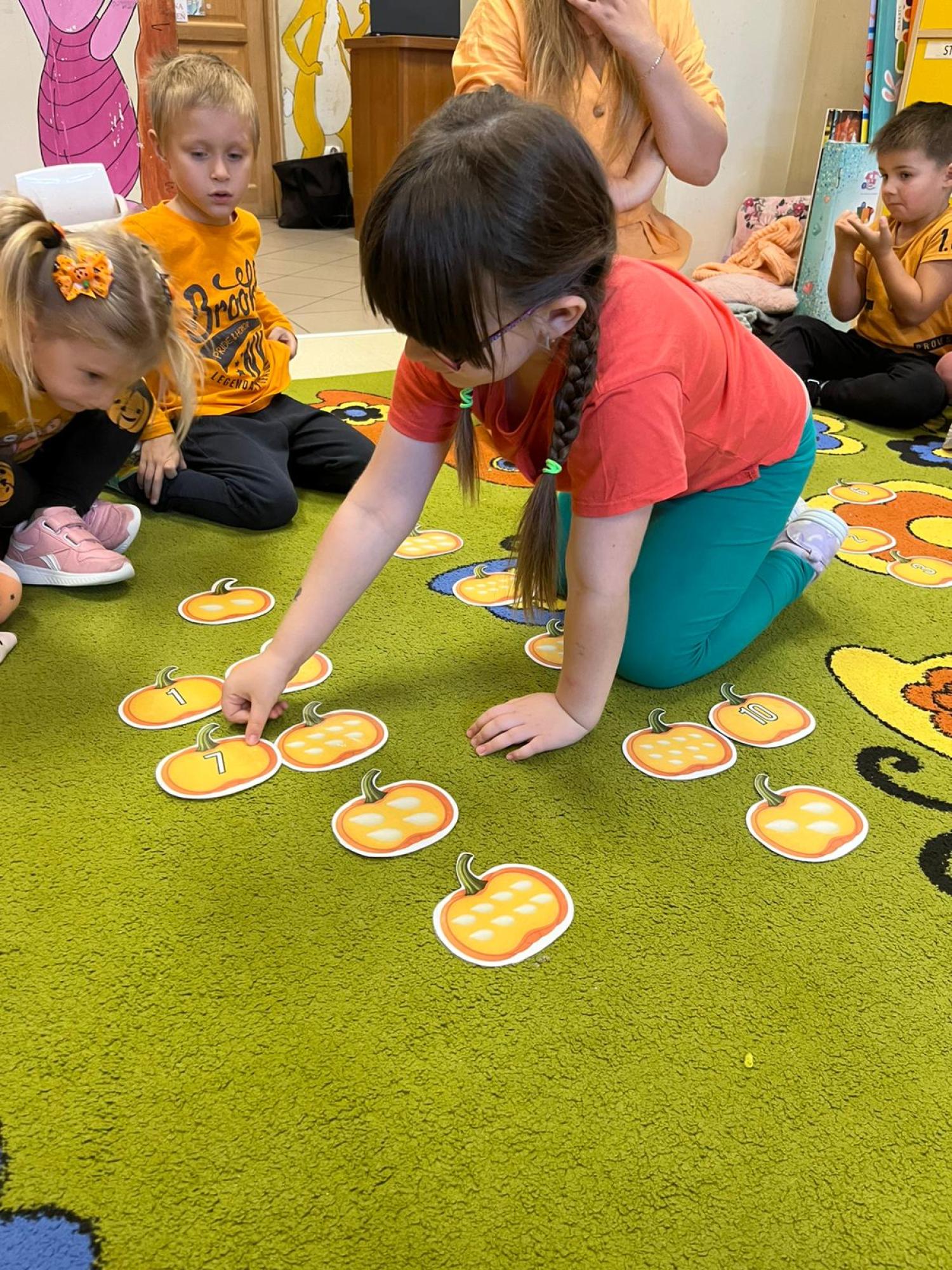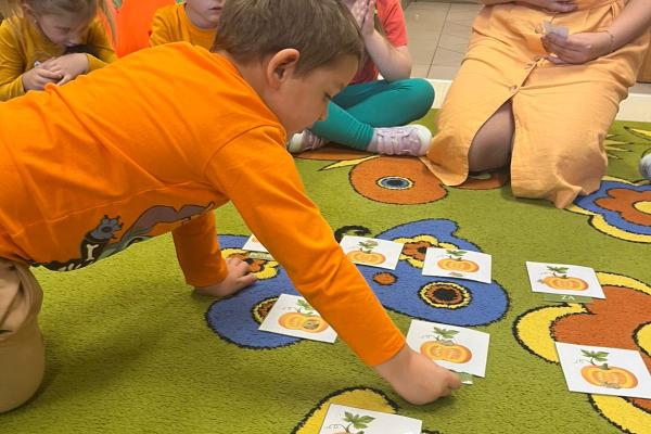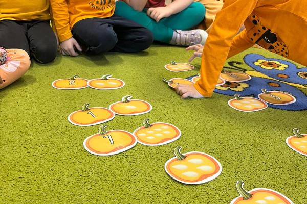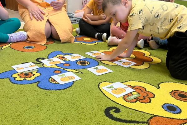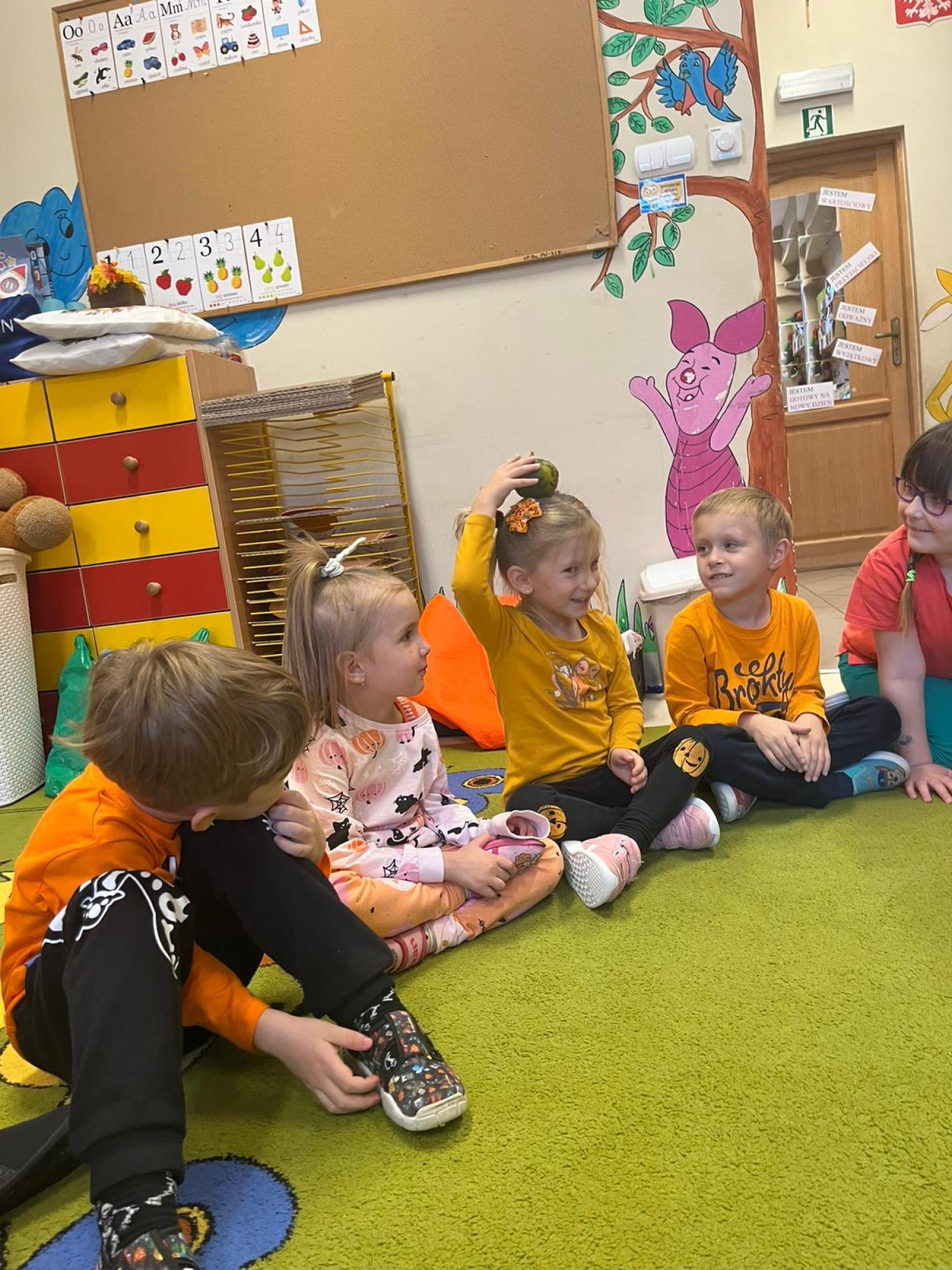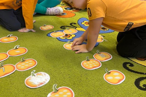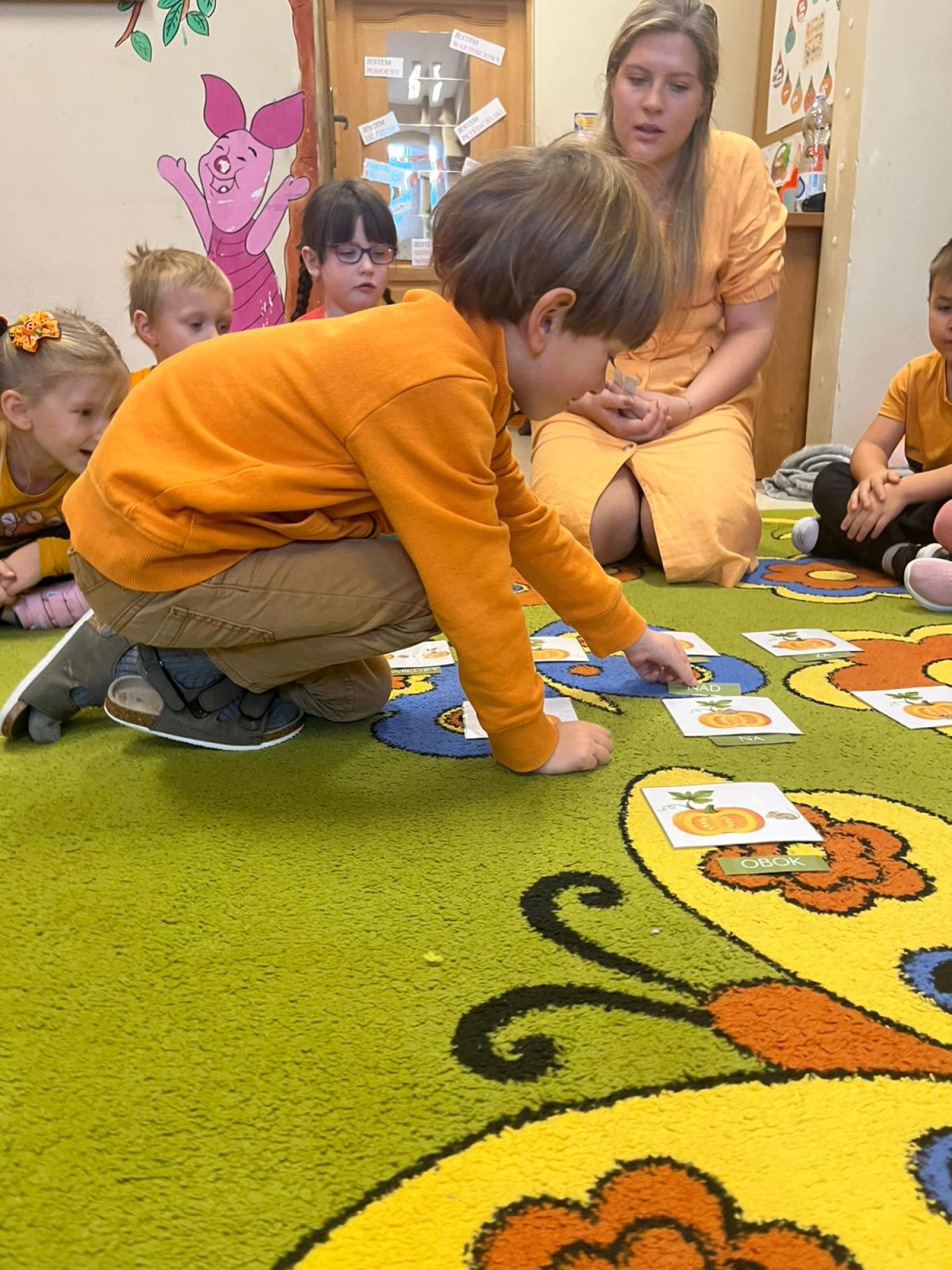 Nie zabrakło również zabaw edukacyjnych. Przedszkolaki przeliczały dyniowe pestki, dopasowywały liczby do odpowiednich ilości, a także układały dyniowe puzzle, ćwicząc przy tym spostrzegawczość i logiczne myślenie. Podczas zabaw dzieci utrwalały również określenia położenia przedmiotów na rysunku i względem własnego ciała, co dostarczyło im wiele radości i ruchu.