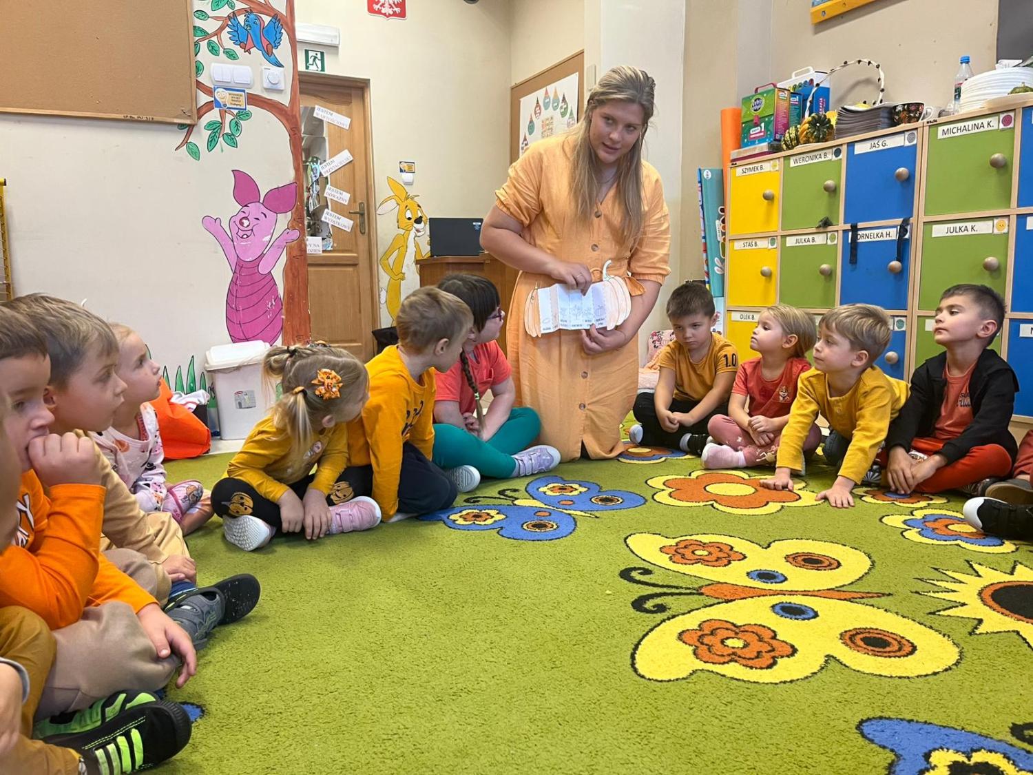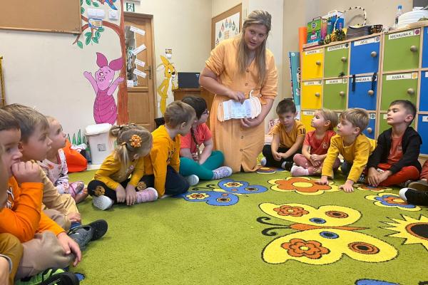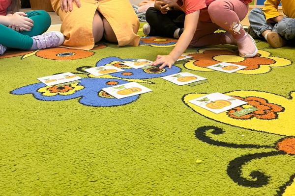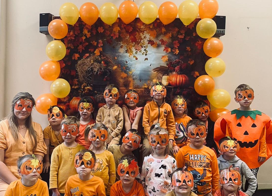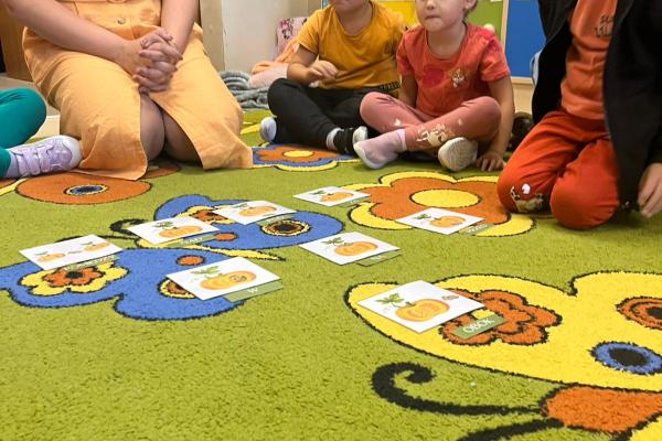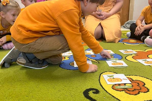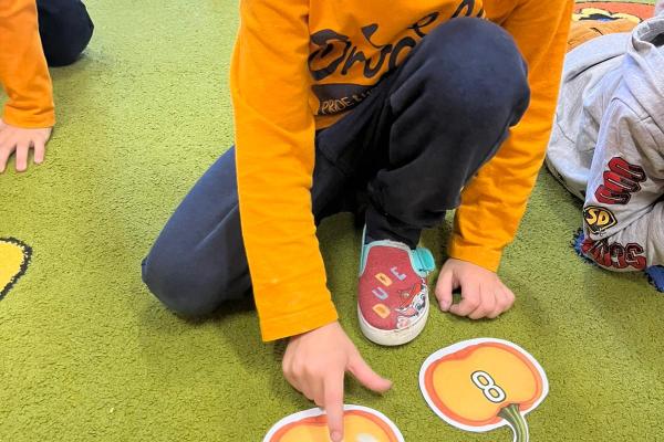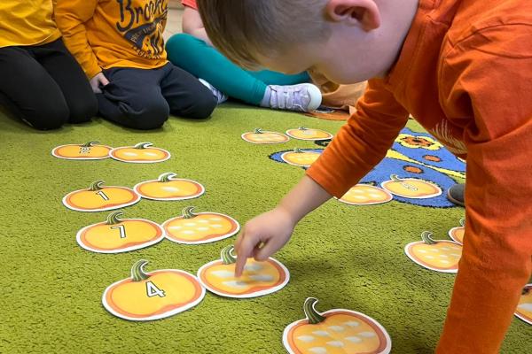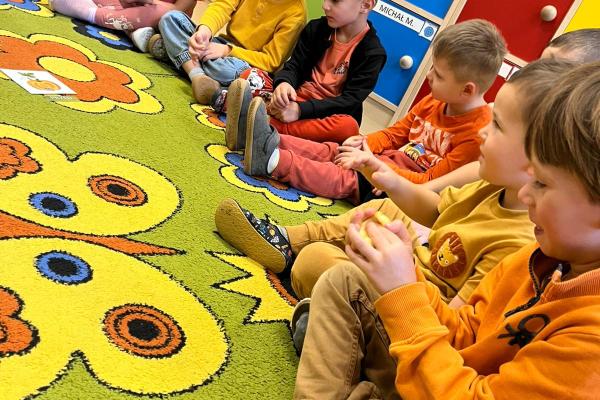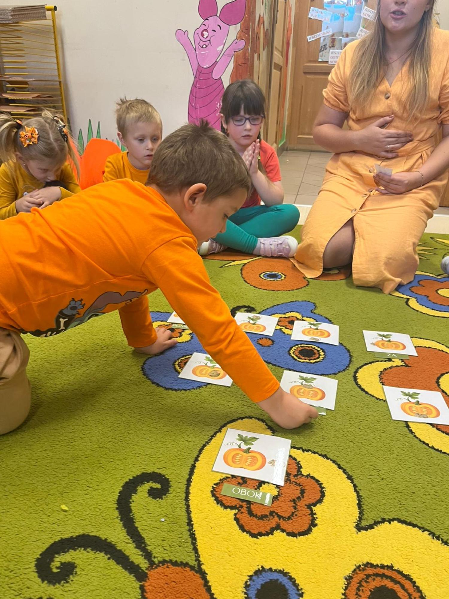 Nie zabrakło również zabaw edukacyjnych. Przedszkolaki przeliczały dyniowe pestki, dopasowywały liczby do odpowiednich ilości, a także układały dyniowe puzzle, ćwicząc przy tym spostrzegawczość i logiczne myślenie. Podczas zabaw dzieci utrwalały również określenia położenia przedmiotów na rysunku i względem własnego ciała, co dostarczyło im wiele radości i ruchu.
