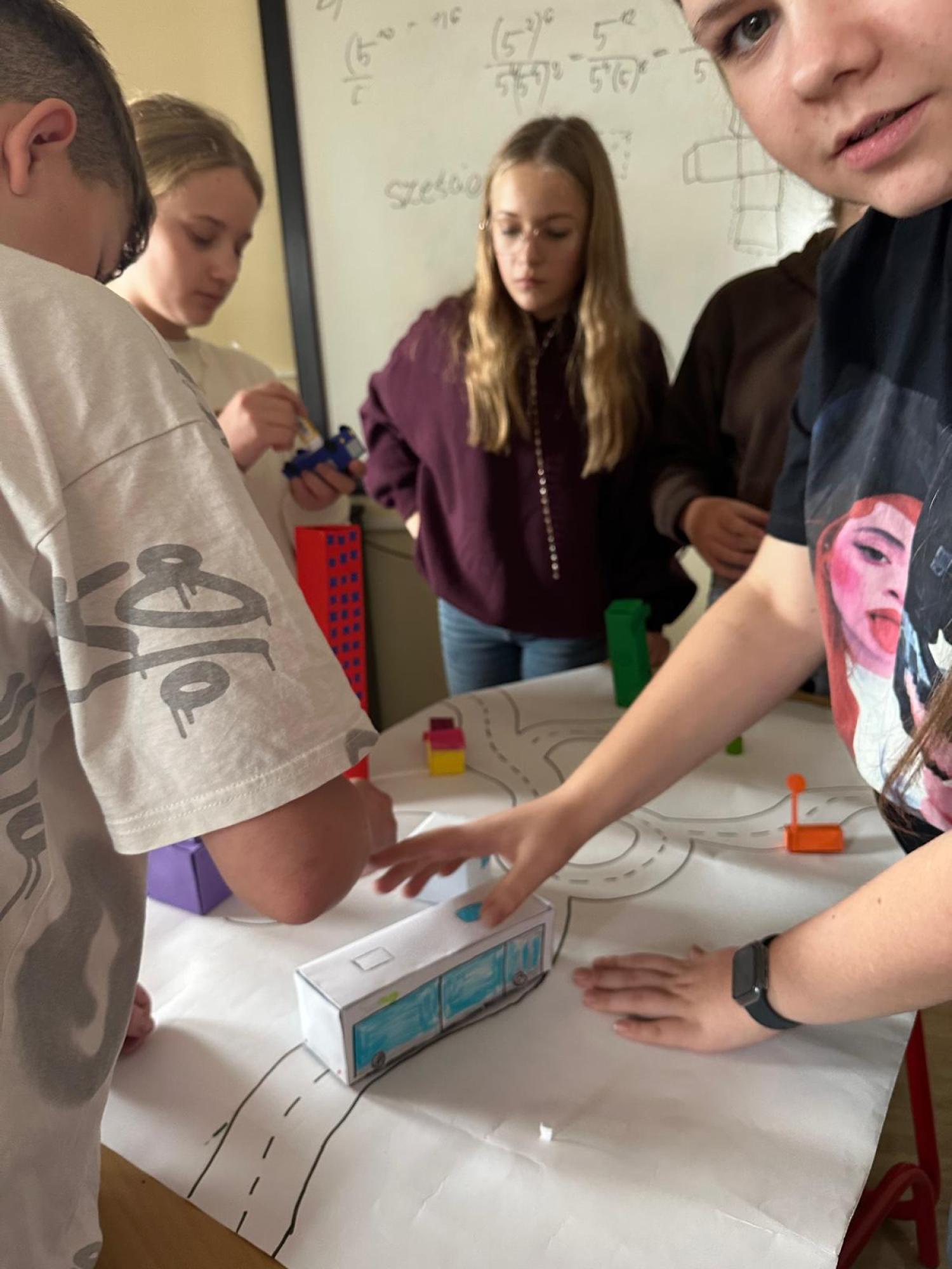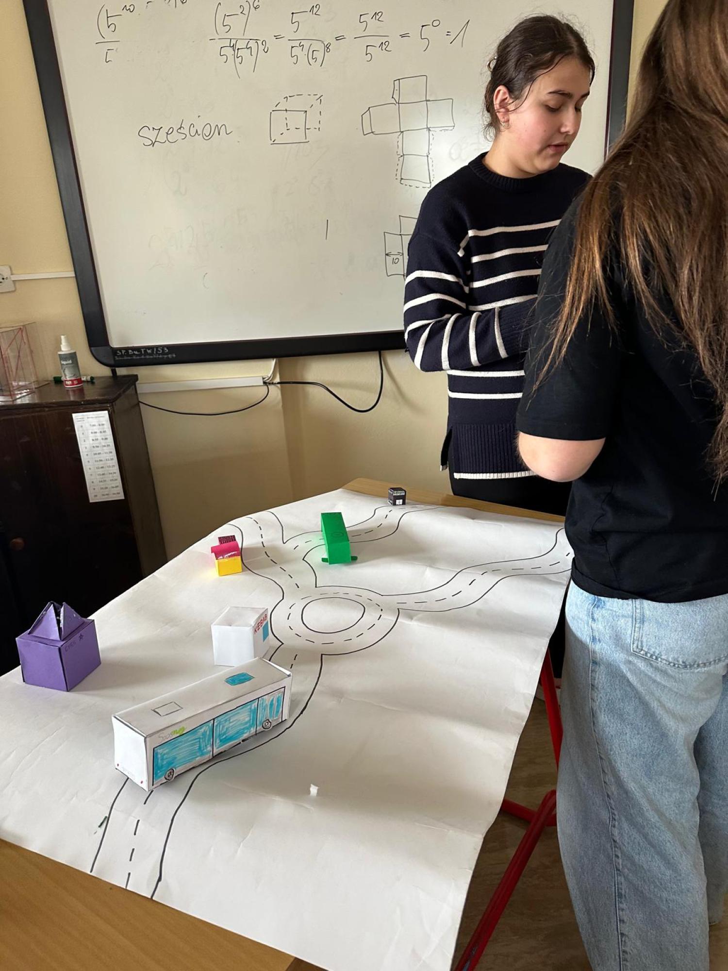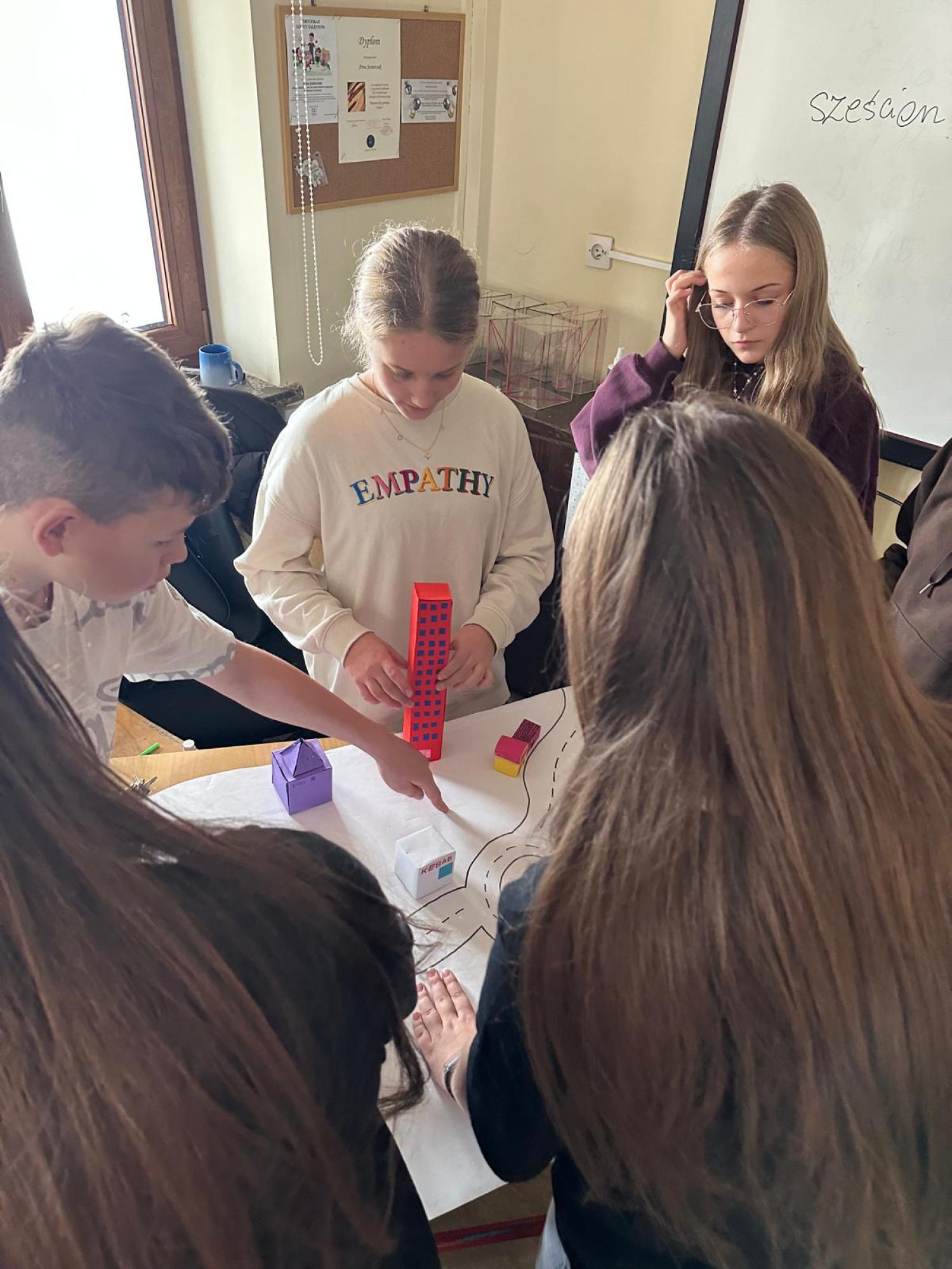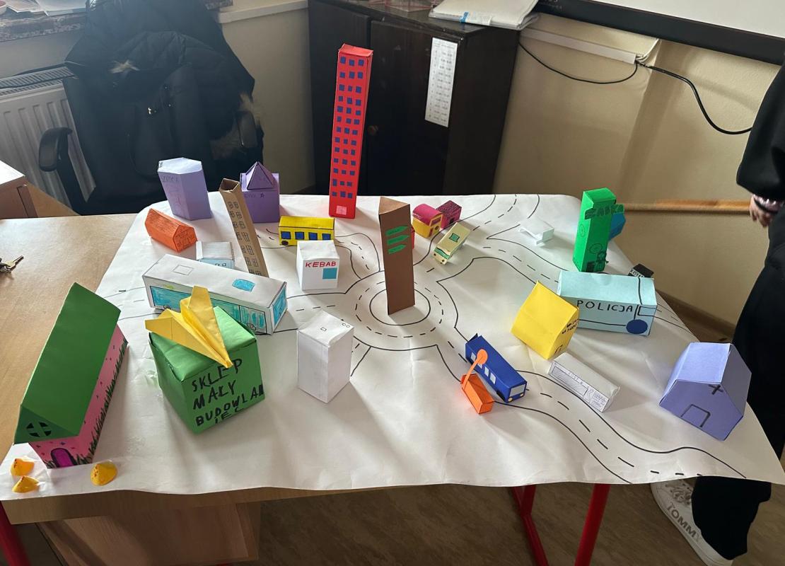 Już na początku lekcji uczniowie przypomnieli sobie najważniejsze informacje o graniastosłupach, a następnie każda grupa otrzymała zadanie zaprojektowania i wykonania budowli, która stanie się częścią wspólnej miejskiej makiety. Pojawiły się wieżowce, domy jednorodzinne, sklepy, szkoły, szpital, a nawet kilka pojazdów – wszystkie zbudowane z kolorowego kartonu, papieru technicznego i wyobraźni uczniów.
