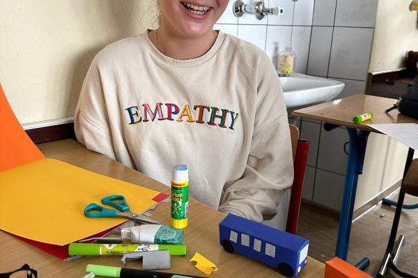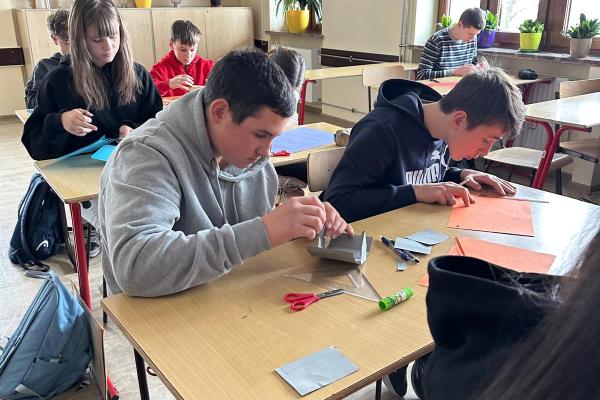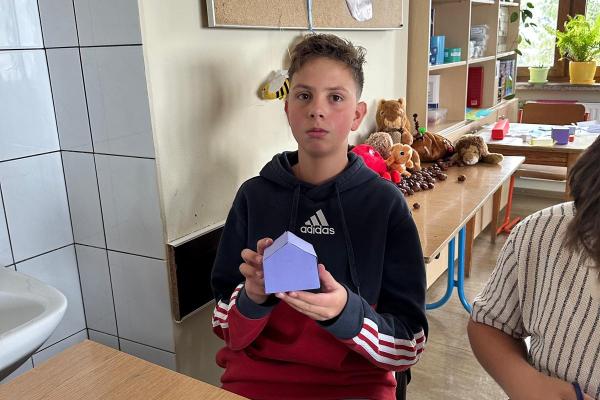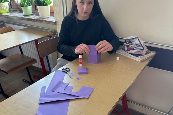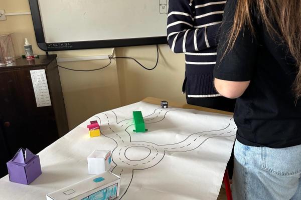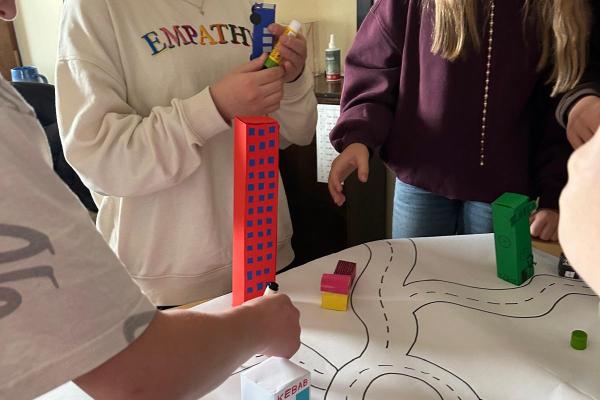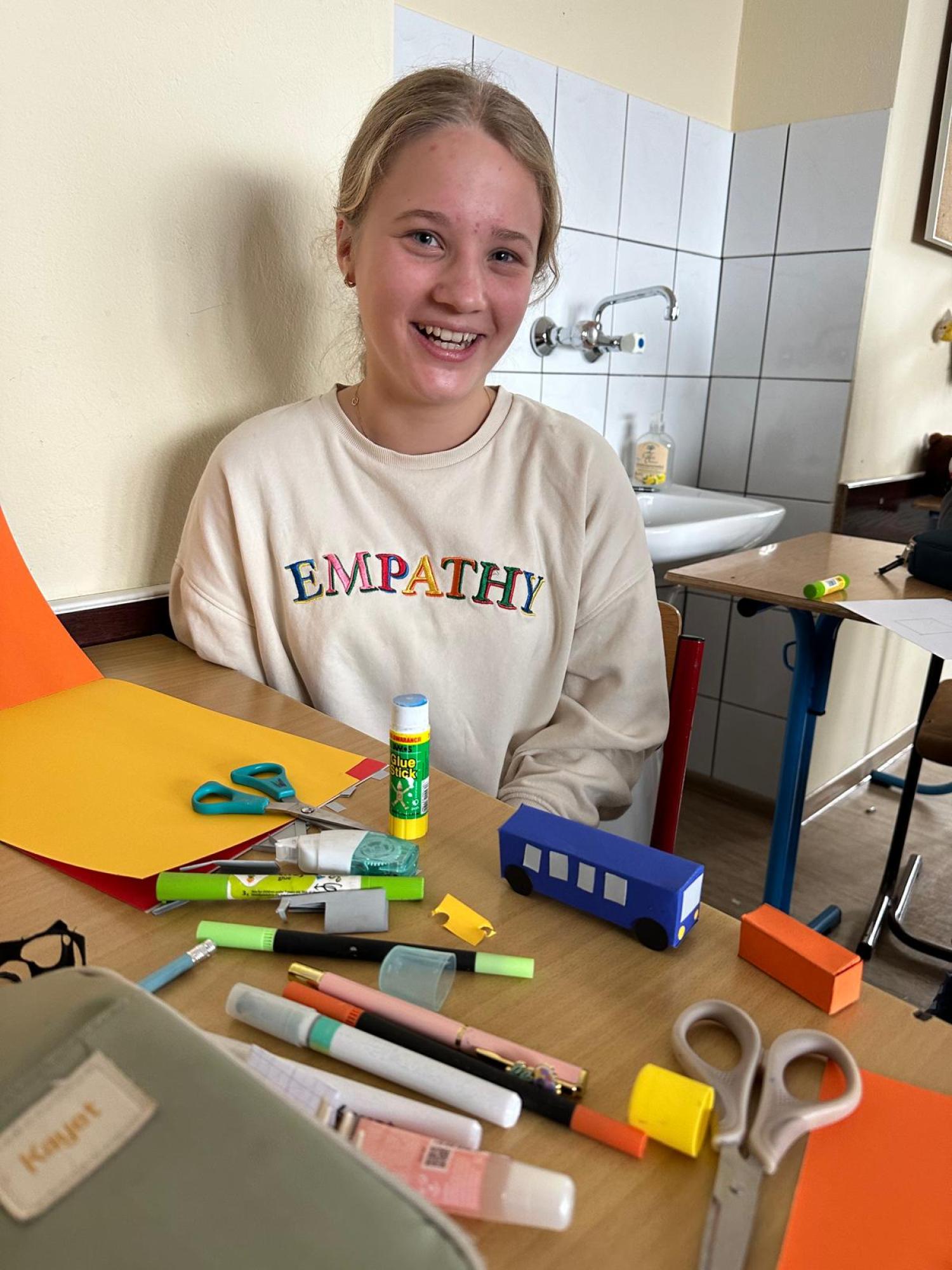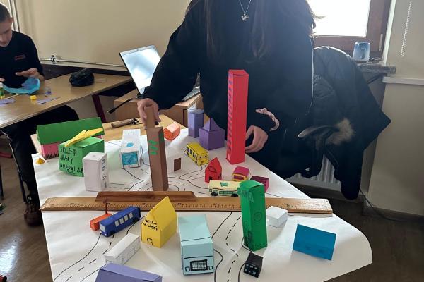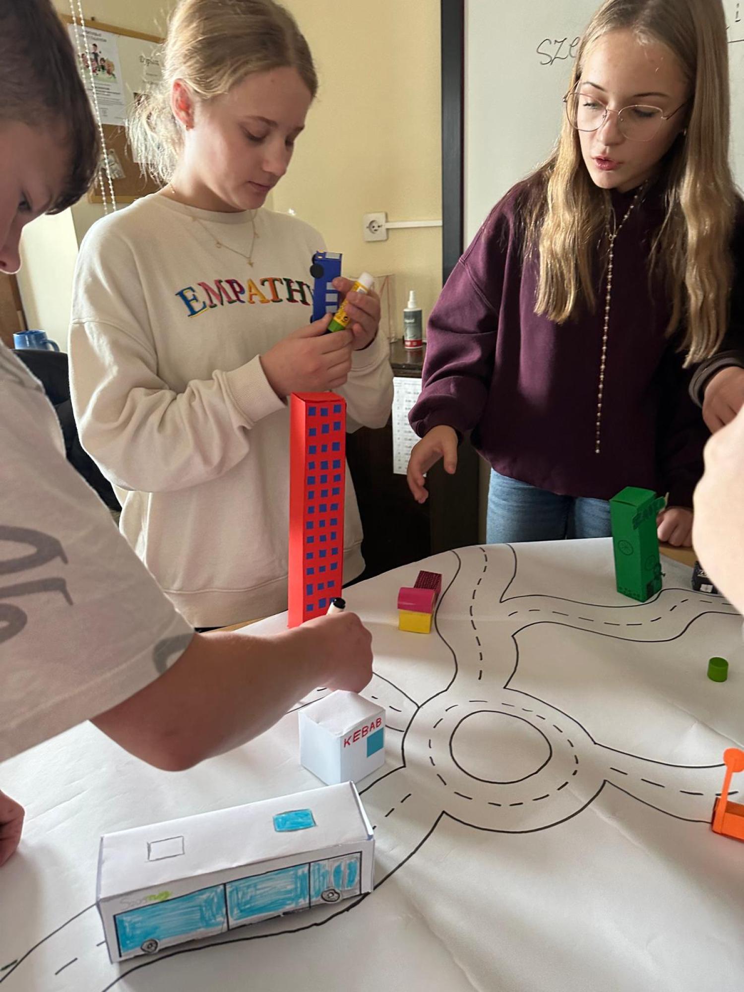 Już na początku lekcji uczniowie przypomnieli sobie najważniejsze informacje o graniastosłupach, a następnie każda grupa otrzymała zadanie zaprojektowania i wykonania budowli, która stanie się częścią wspólnej miejskiej makiety. Pojawiły się wieżowce, domy jednorodzinne, sklepy, szkoły, szpital, a nawet kilka pojazdów – wszystkie zbudowane z kolorowego kartonu, papieru technicznego i wyobraźni uczniów.
