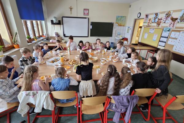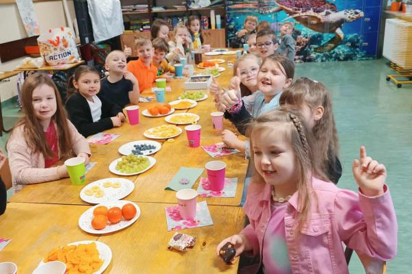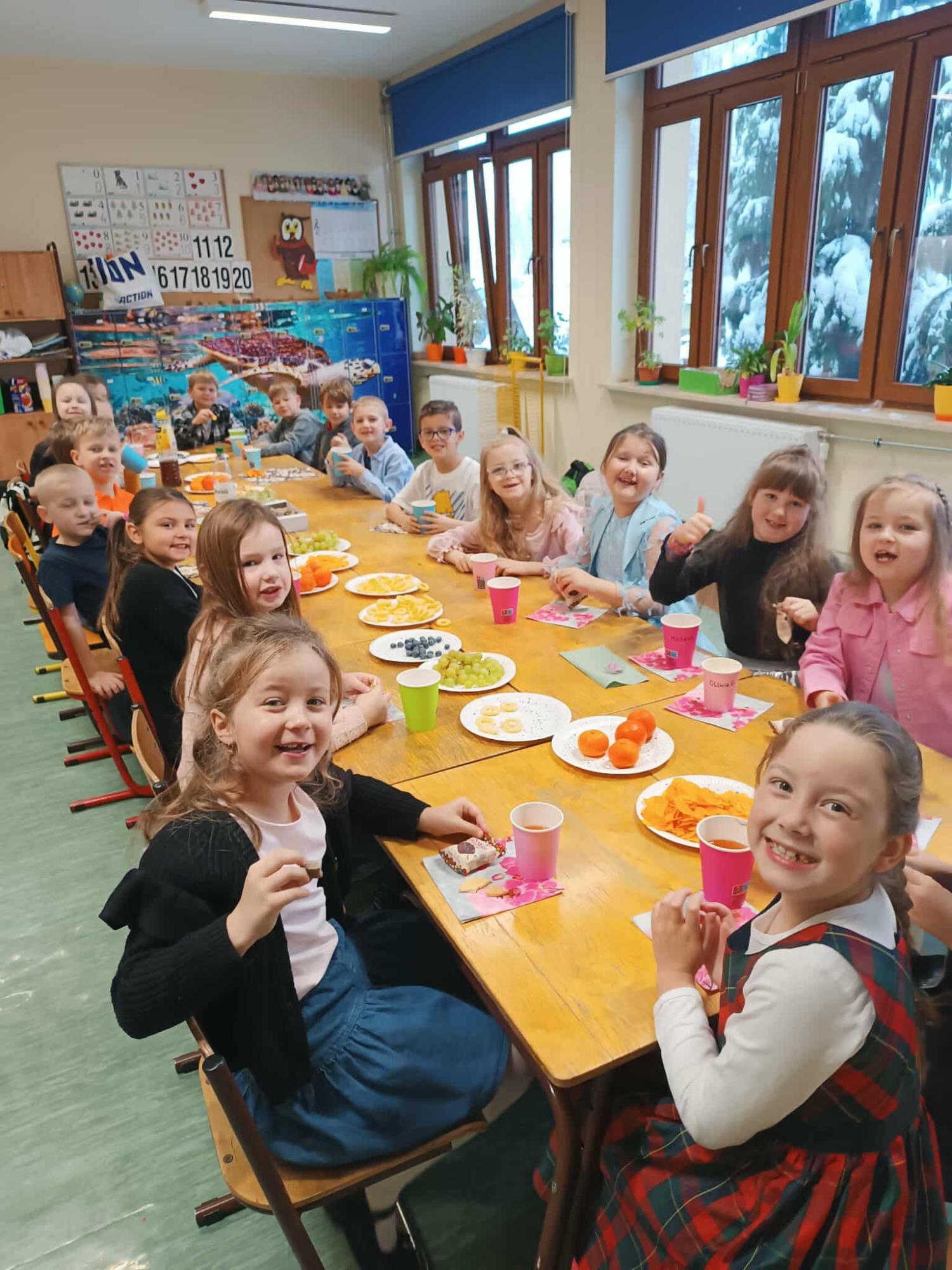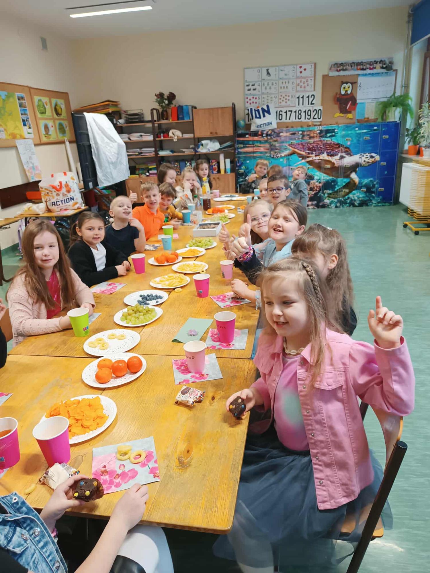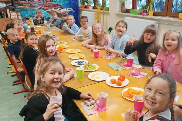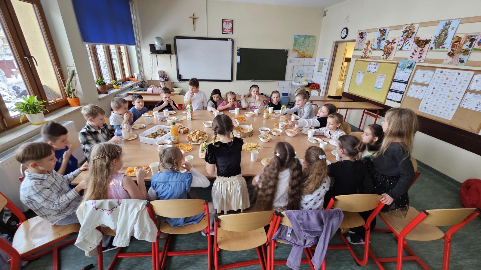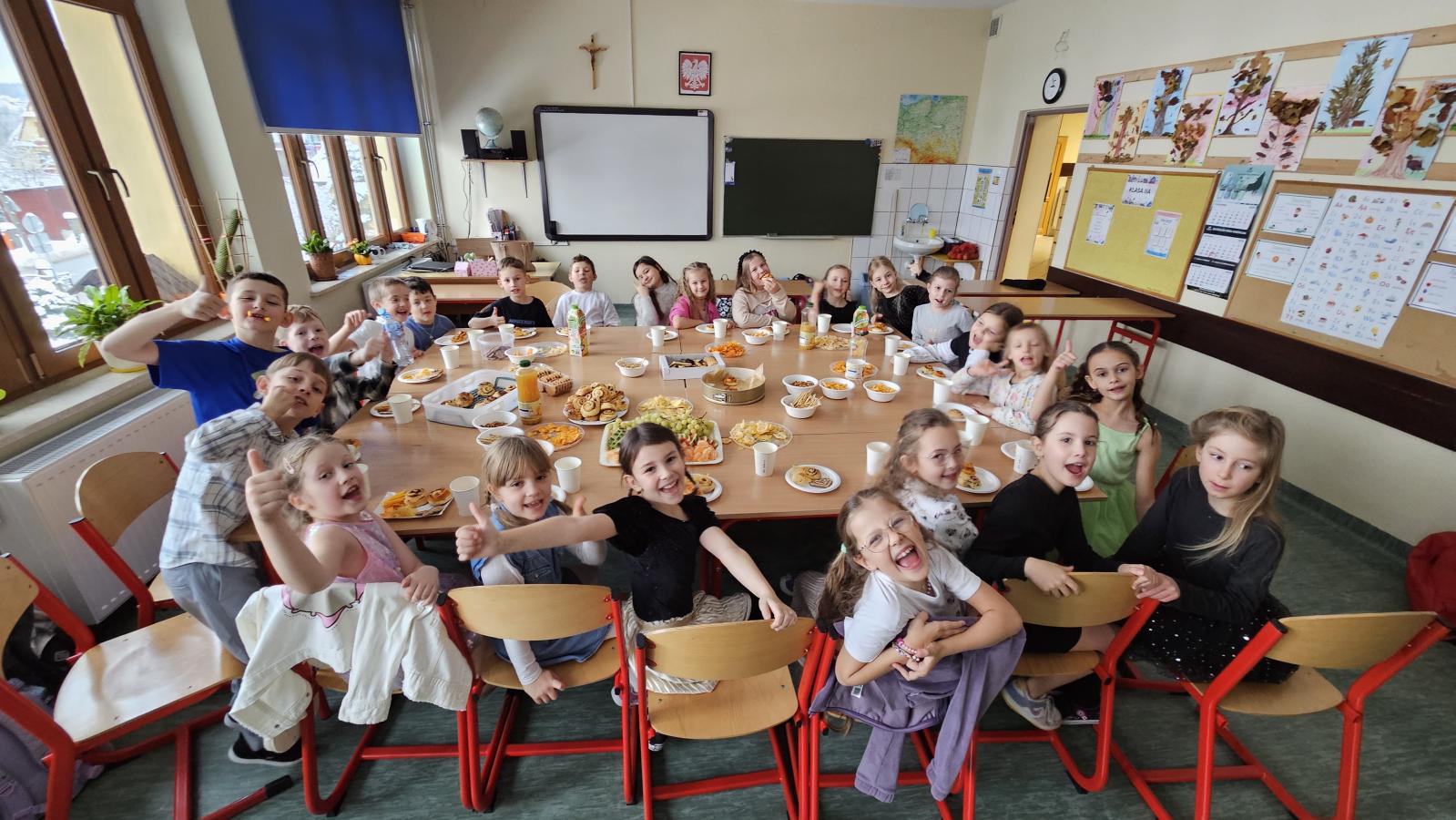 W czasie przerwy rodzice zadbali o słodki poczęstunek, który dodał uczestnikom energii do dalszej zabawy. Stoły pełne smakołyków oraz troska rodziców były miłym akcentem integrującym całą społeczność szkolną.