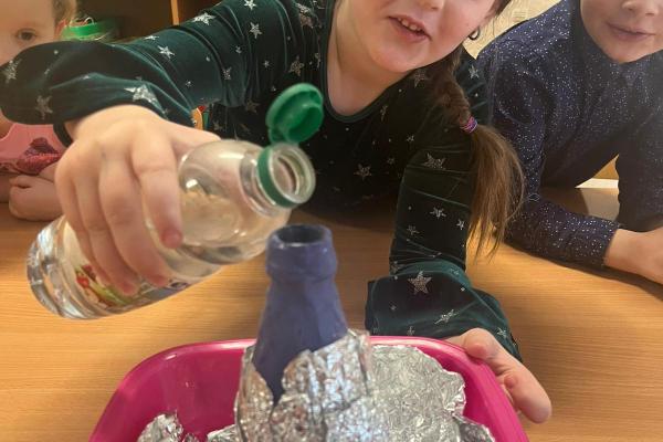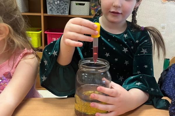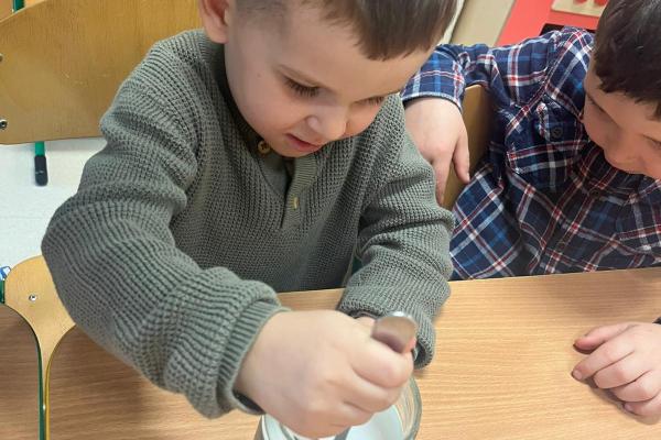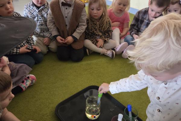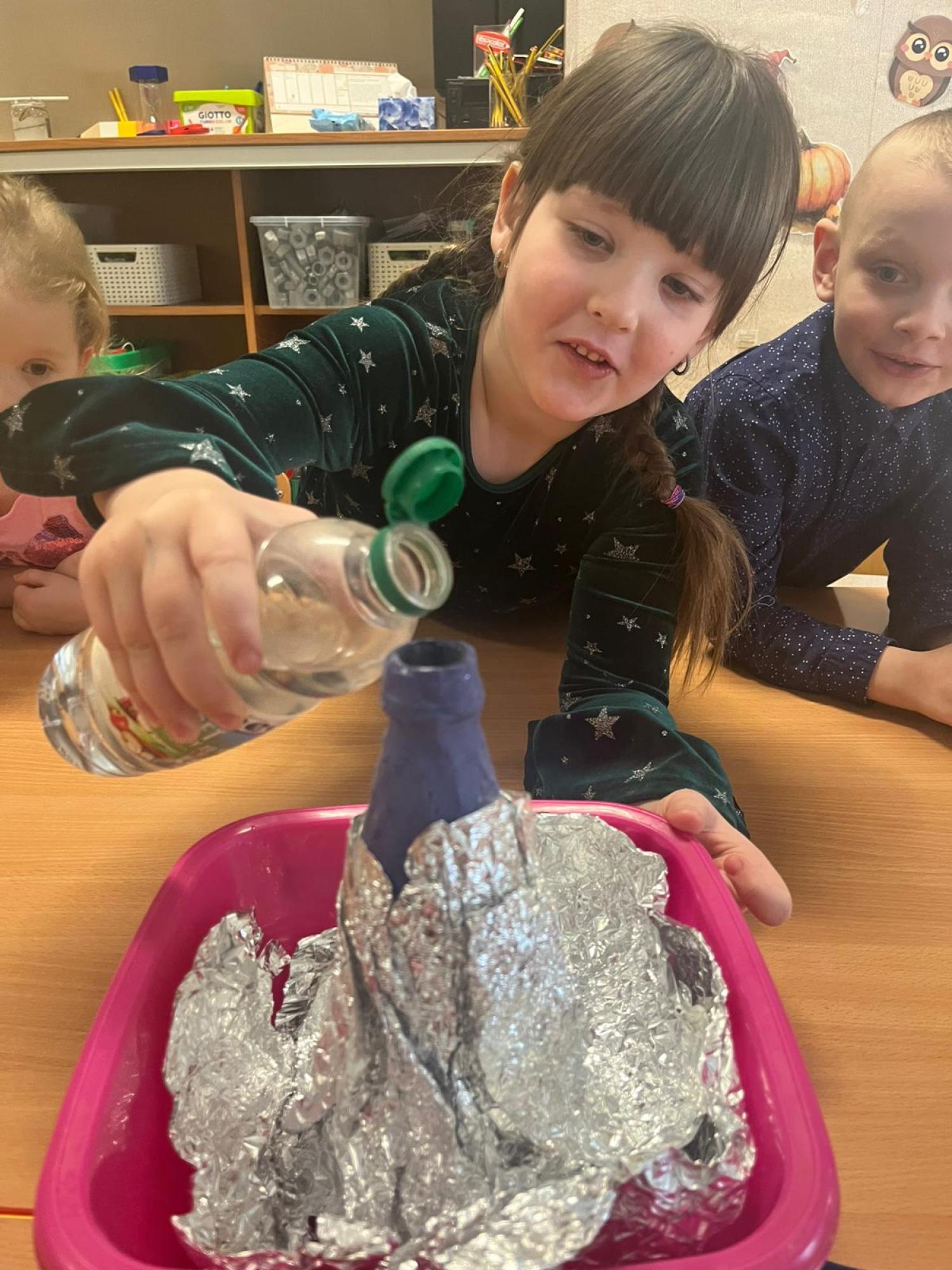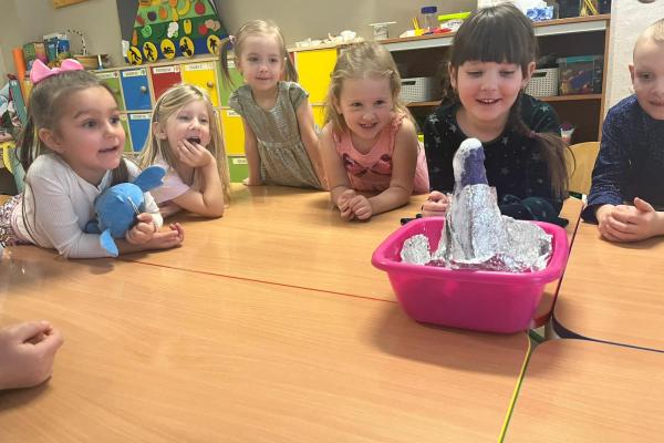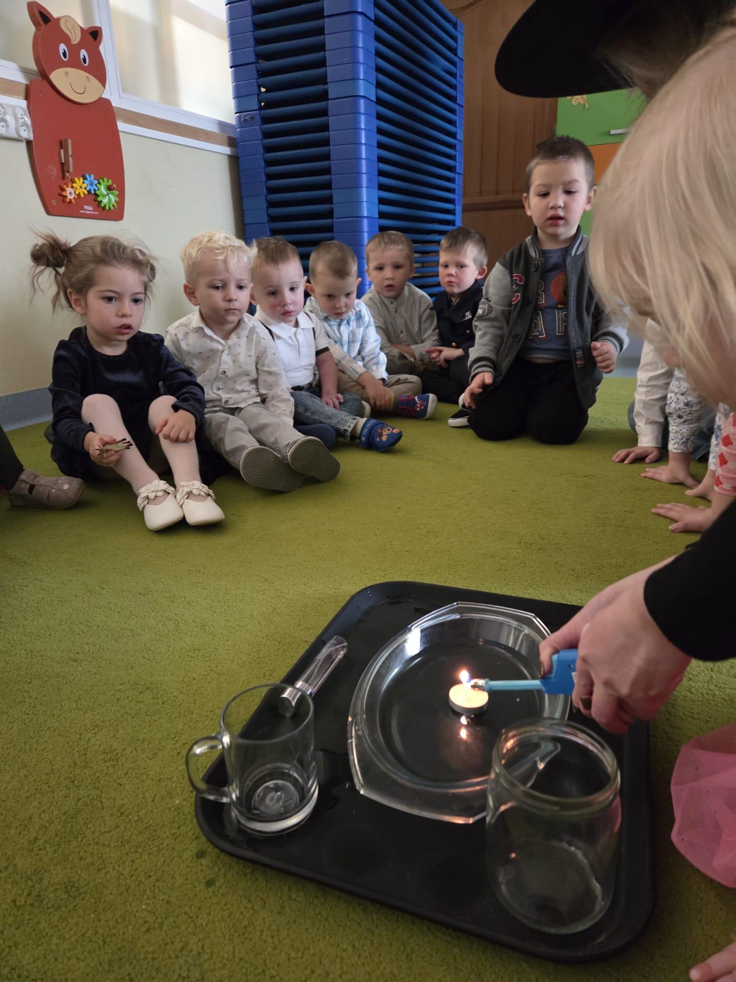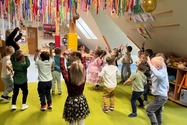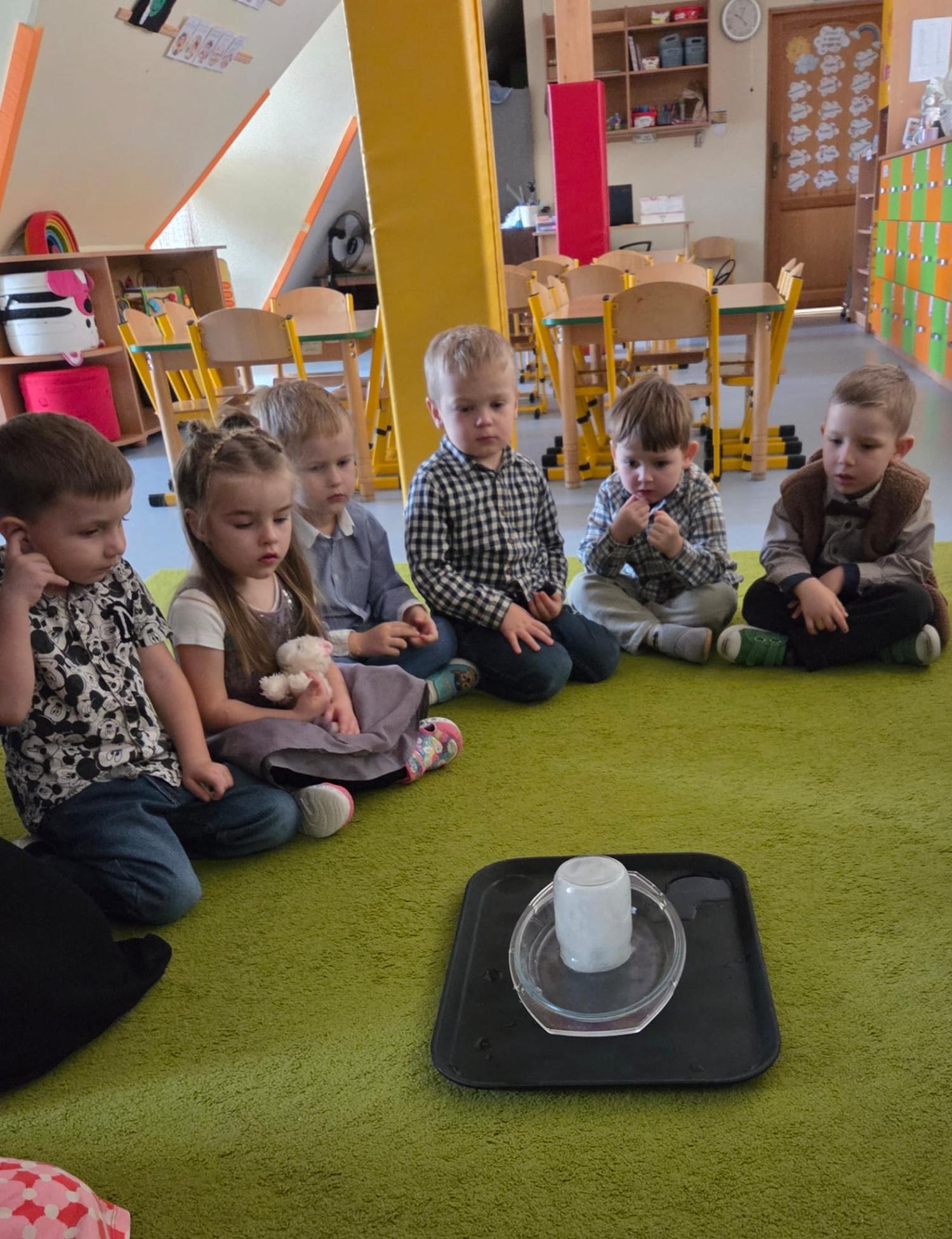 27 listopada 2025 roku w grupach przedszkolnych odbyły się radosne andrzejki, pełne magii i zabawy. Dzieci brały udział w wróżbach „Kim będę w przyszłości?”, zabawach z kolorowymi piórkami i kluczem, a także w magicznych eksperymentach, takich jak wybuchający wulkan i lampa lawa.