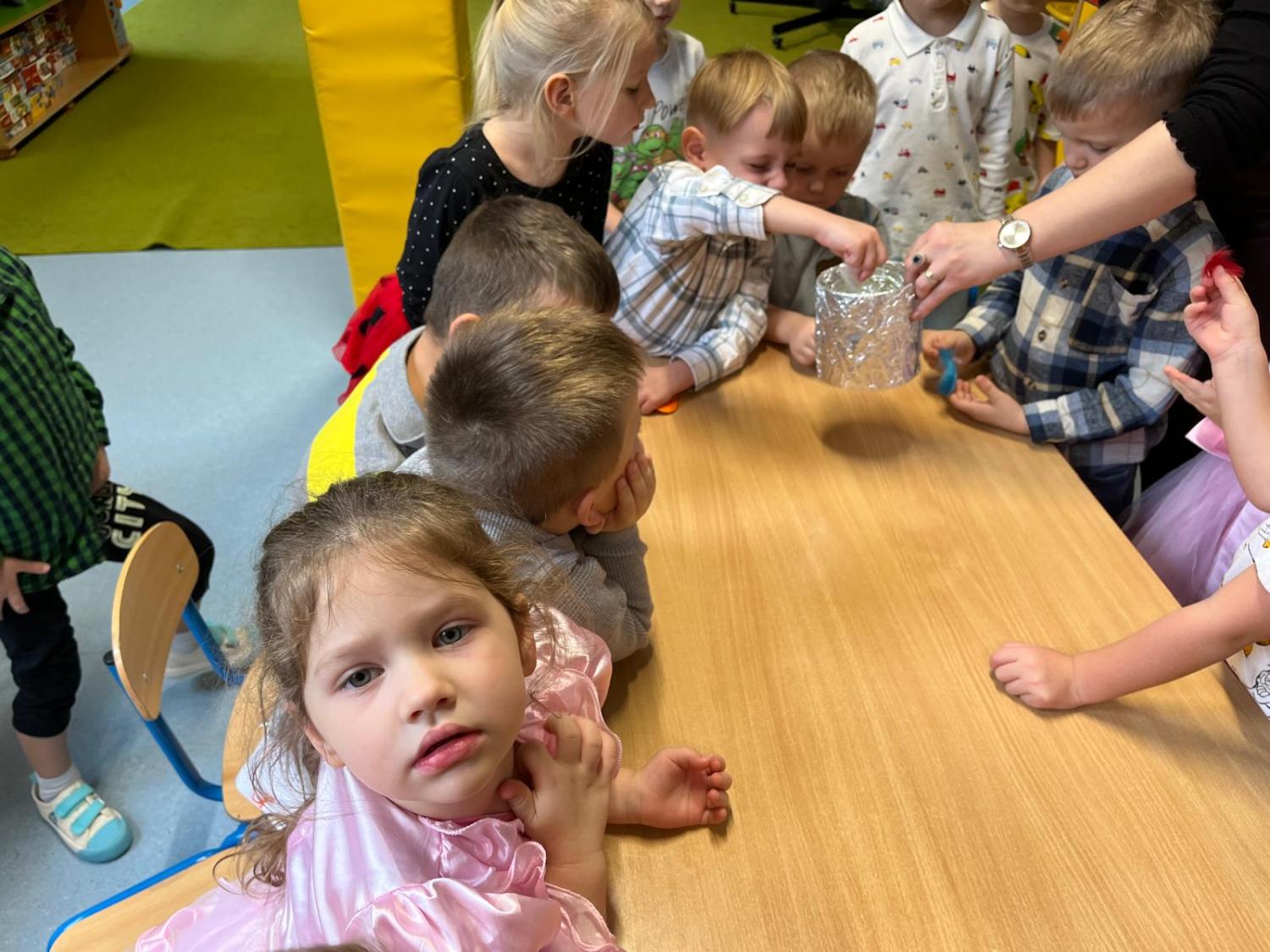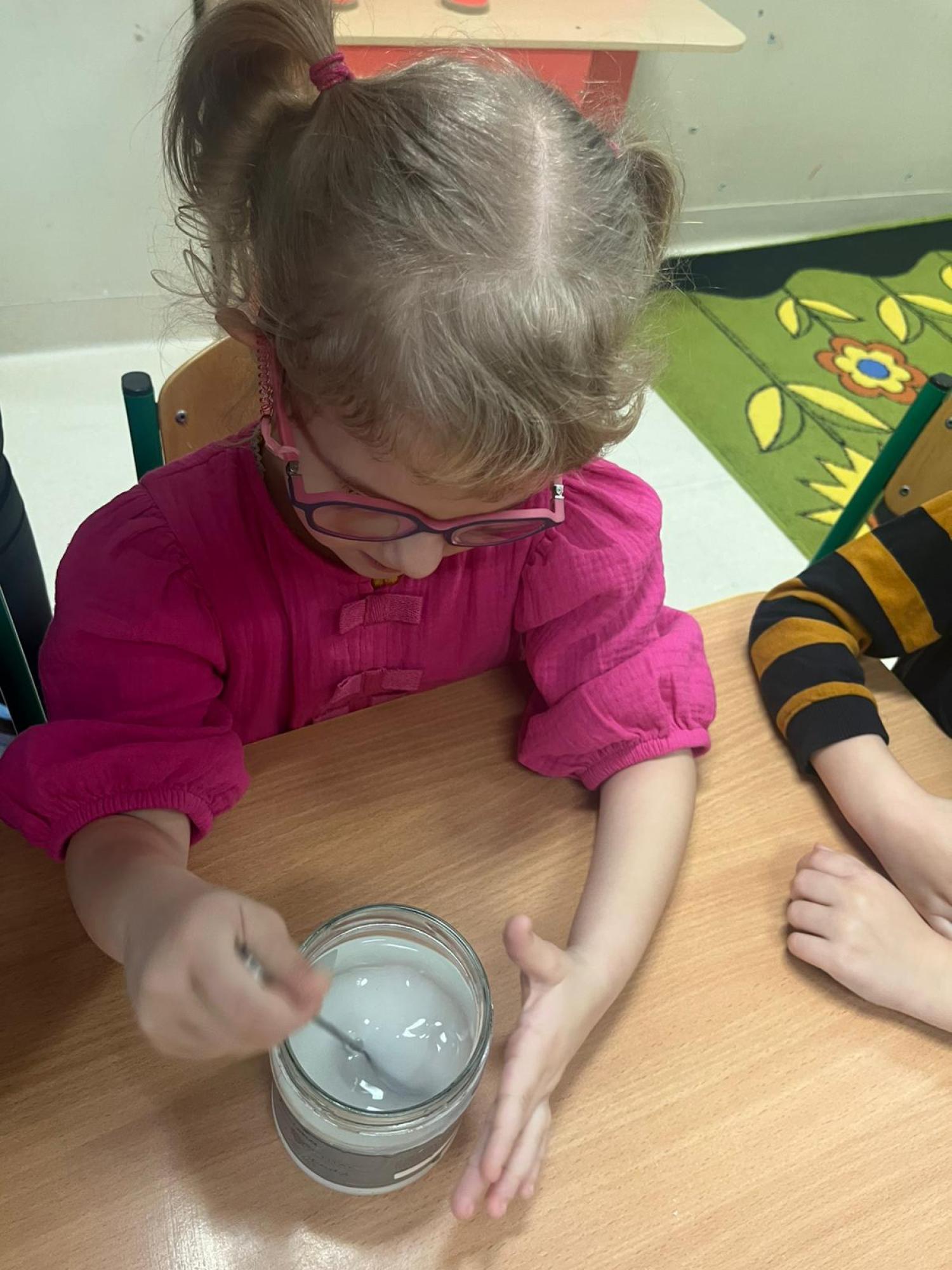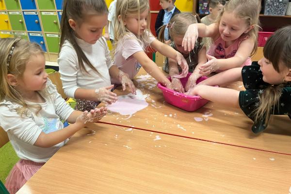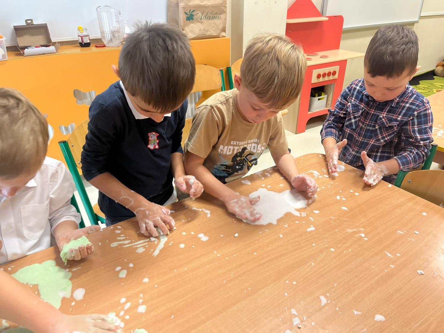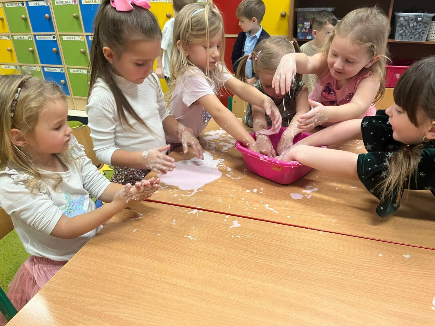 Dzieci miały możliwość zabawy cieczą nienewtonowską, którą same zrobiły, co sprawiło im wiele radości i wzbudziło ogromną ciekawość. Nie zabrakło zabaw ruchowych, tańców przy muzyce oraz wesołych zabaw z balonami. Na zakończenie na wszystkich czekał słodki poczęstunek.