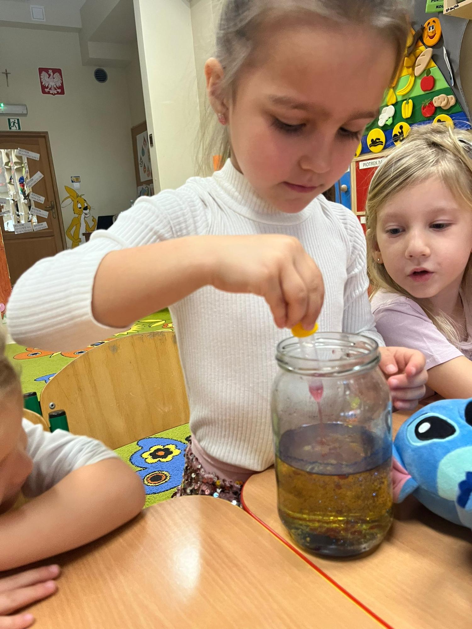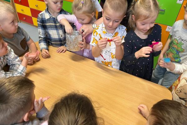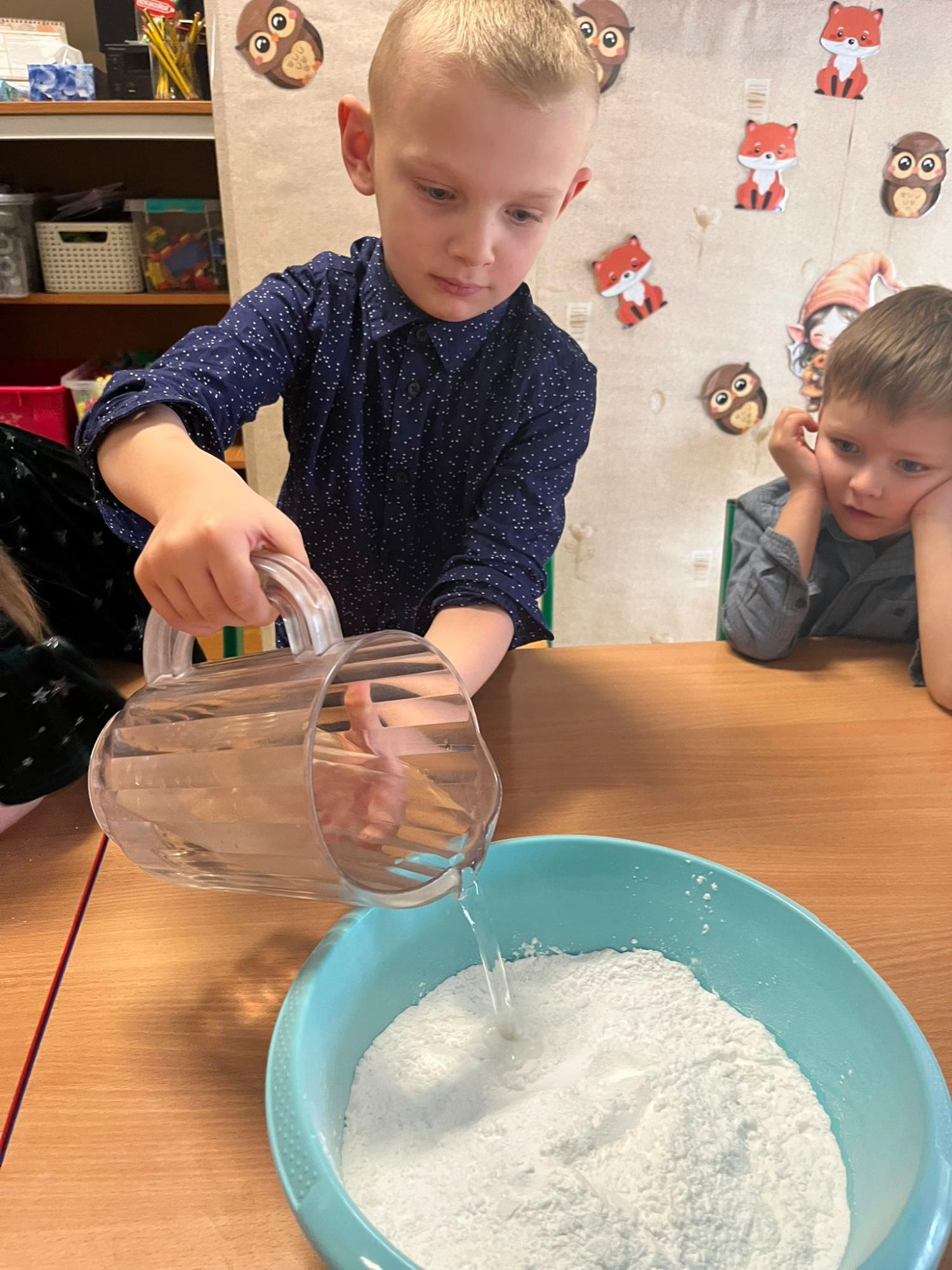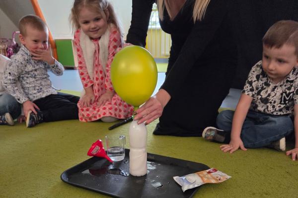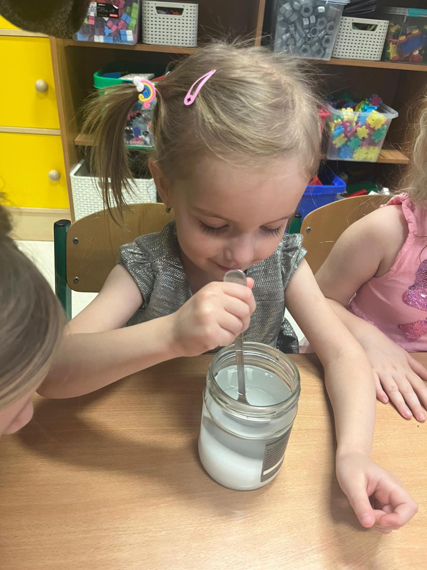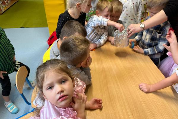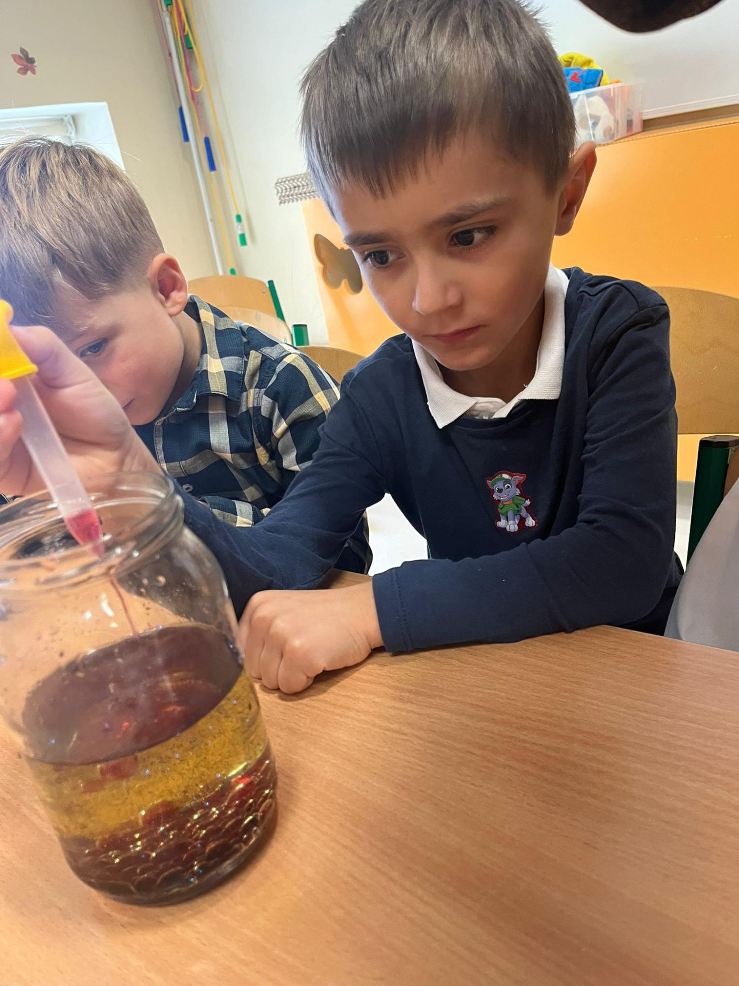 Dzieci miały możliwość zabawy cieczą nienewtonowską, którą same zrobiły, co sprawiło im wiele radości i wzbudziło ogromną ciekawość. Nie zabrakło zabaw ruchowych, tańców przy muzyce oraz wesołych zabaw z balonami. Na zakończenie na wszystkich czekał słodki poczęstunek.