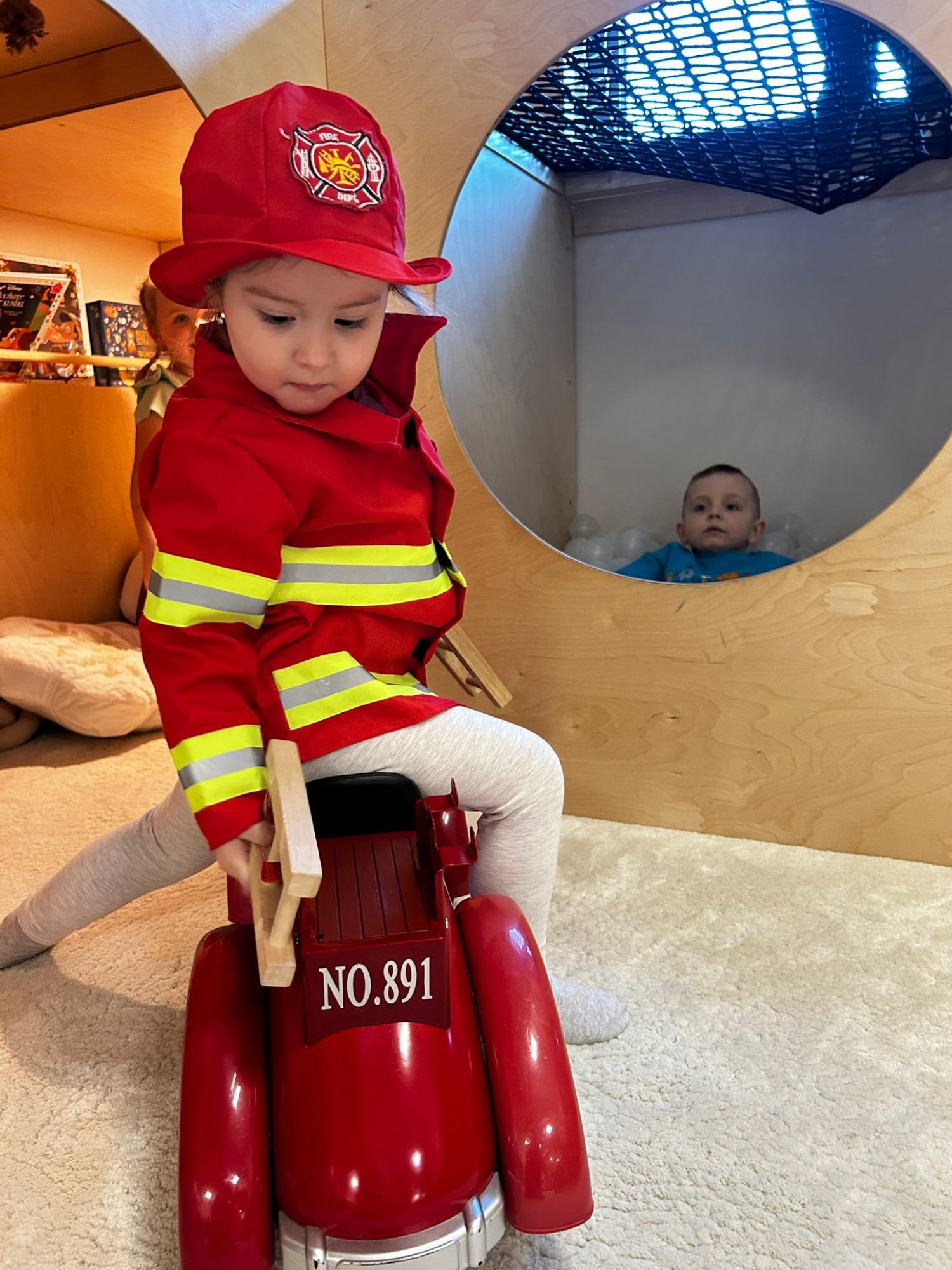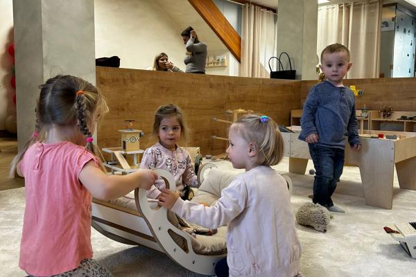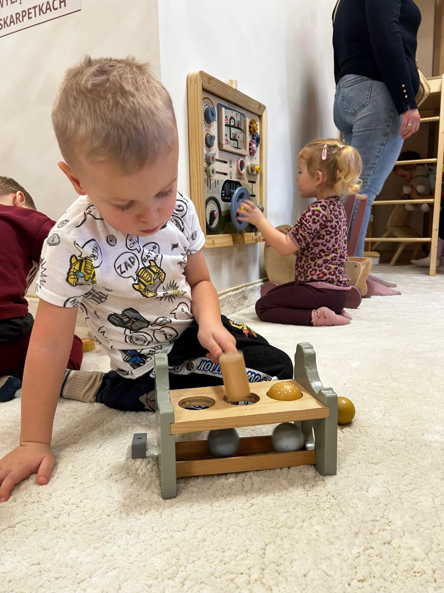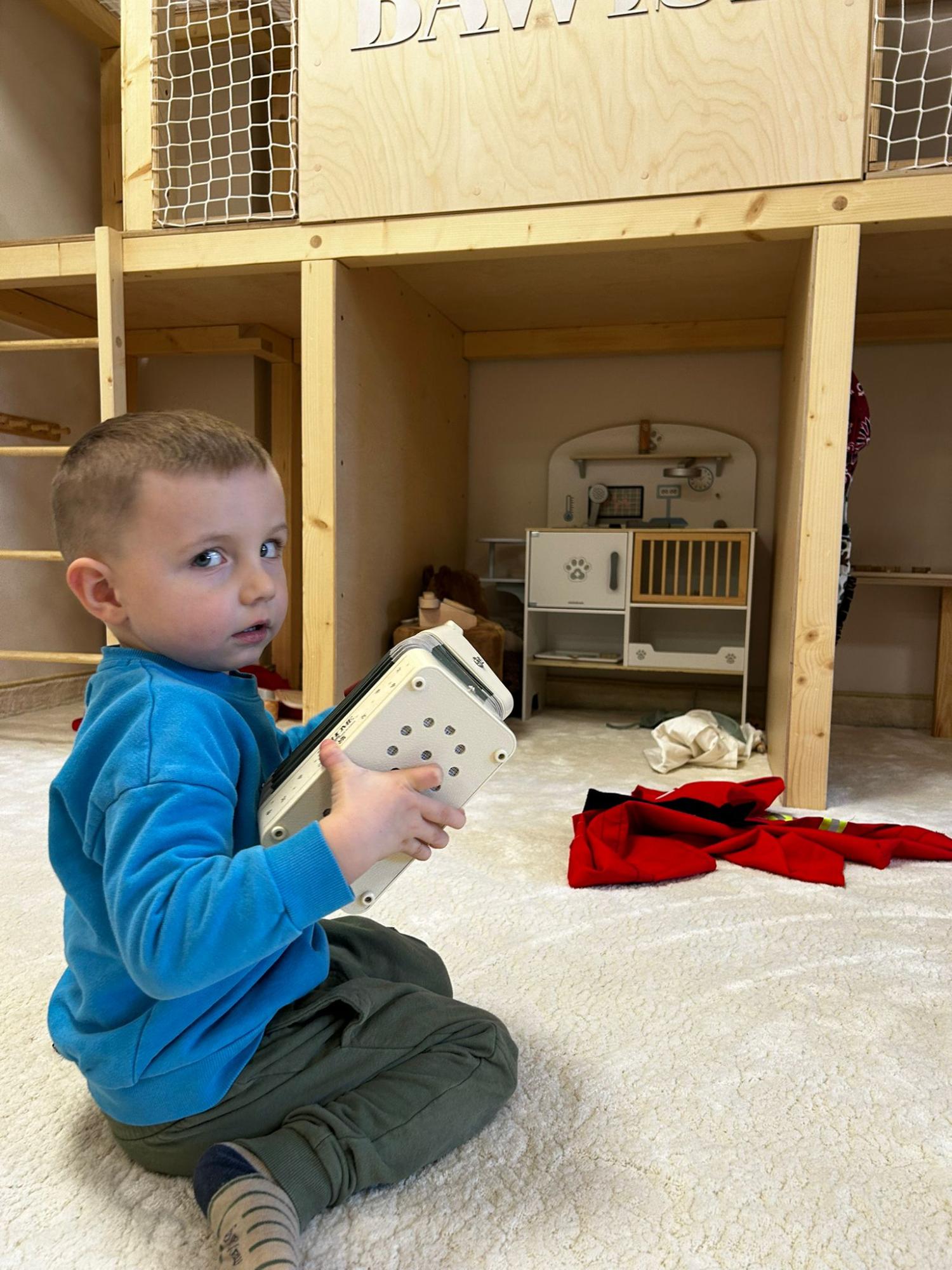 Po zajęciach przyszedł czas na swobodną zabawę. Dzieci mogły wcielać się w różne zawody dzięki licznym atrybutom, korzystać z zabawek sensorycznych, tablic manipulacyjnych, zjeżdżalni, autek, kącika z książkami oraz oczywiście z uwielbianych kulek. Dużo emocji dostarczyła także konstrukcja do wspinania, która zachęcała do aktywności i pokonywania małych wyzwań.