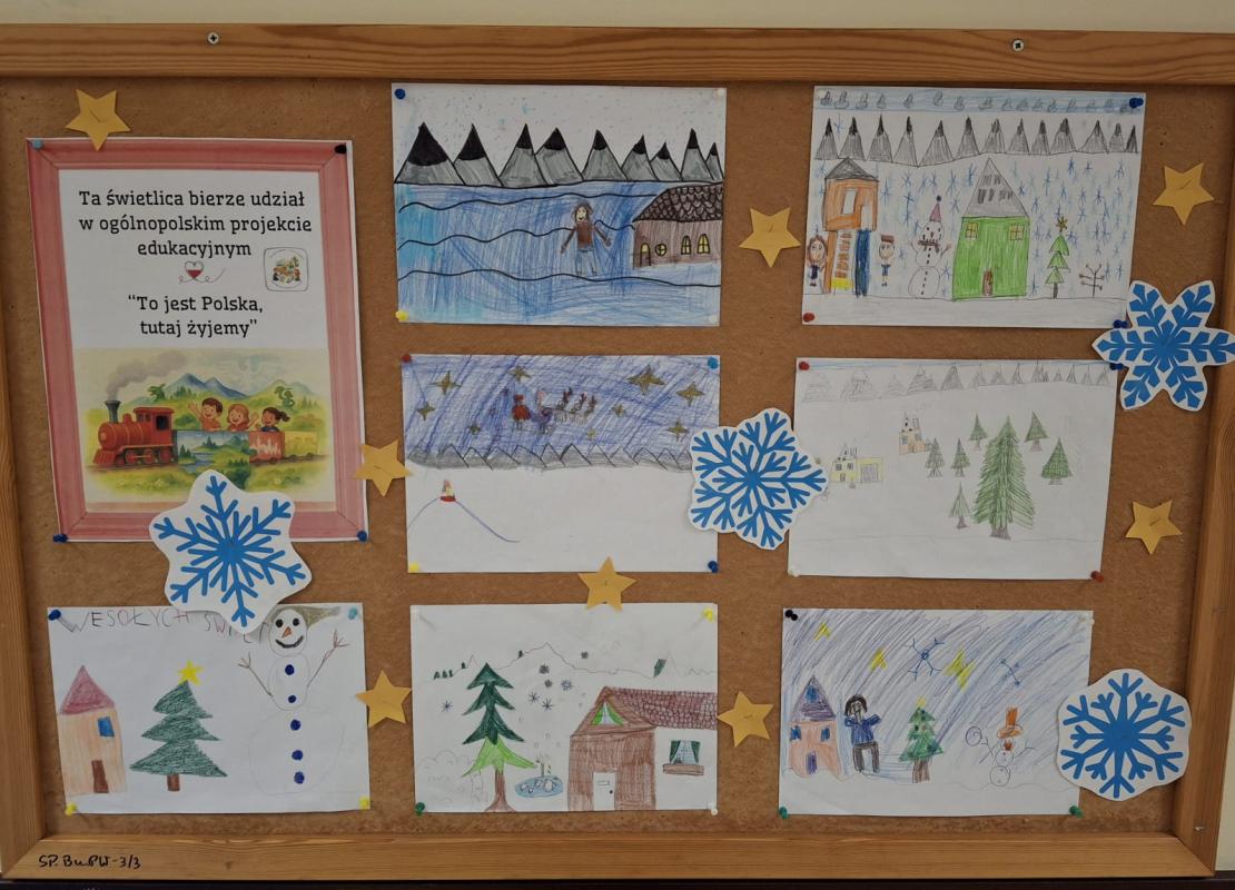 W styczniu dzieci uczęszczające na zajęcia w świetlicy szkolnej zrealizowały kolejne zadanie w ramach projektu „To jest Polska, tutaj żyjemy”. Tematem były zimowe krajobrazy Polski.