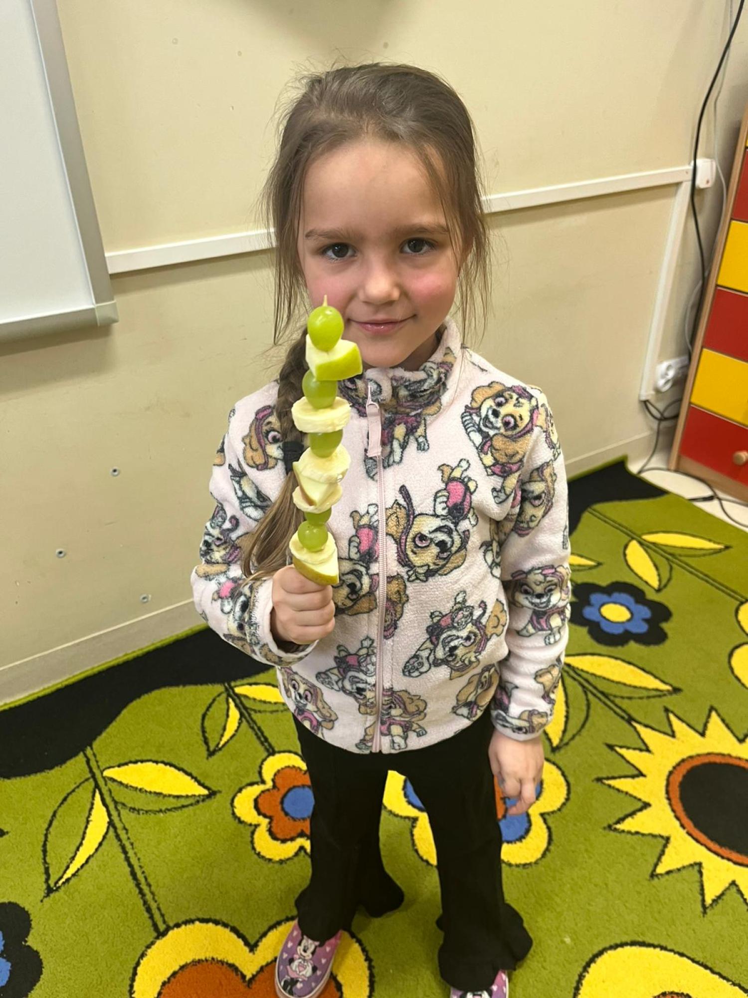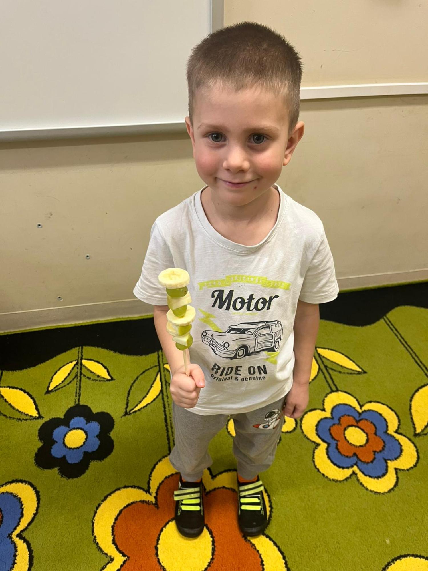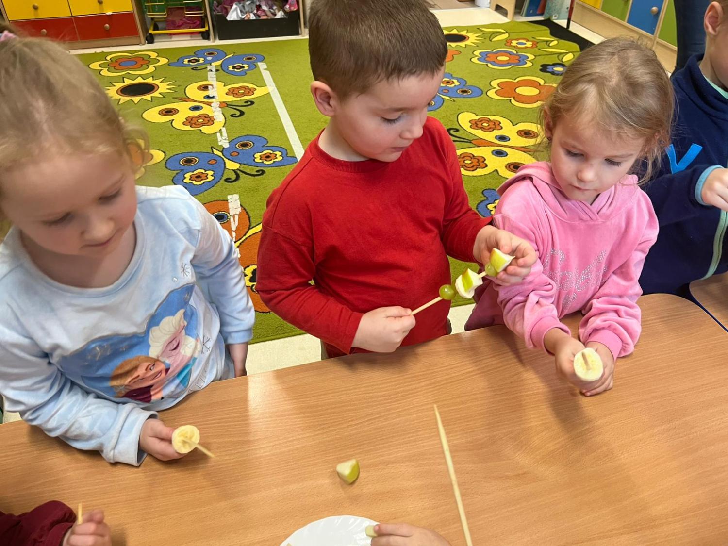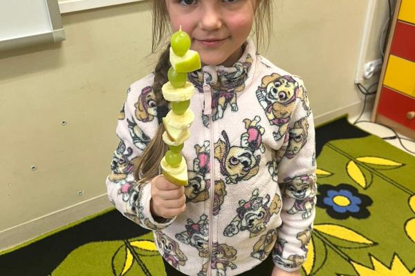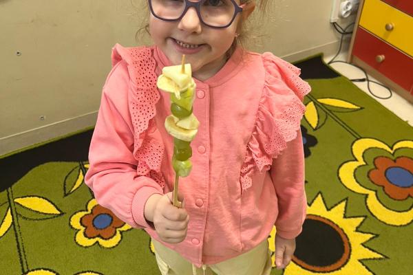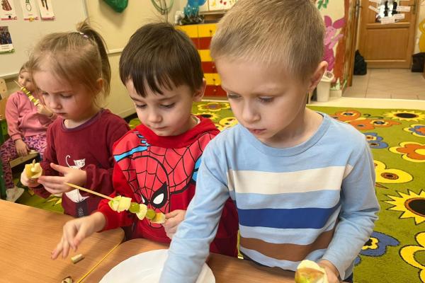 Dzieci przygotowały zdrową przekąskę na bal – kolorowe, owocowe szaszłyki, ucząc się zasad zdrowego odżywiania i współpracy. Zajęcia upłynęły w radosnej, karnawałowej atmosferze i były doskonałym połączeniem zabawy oraz nauki.