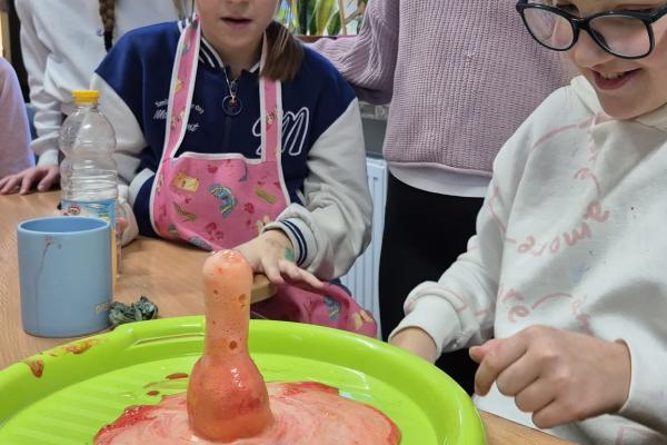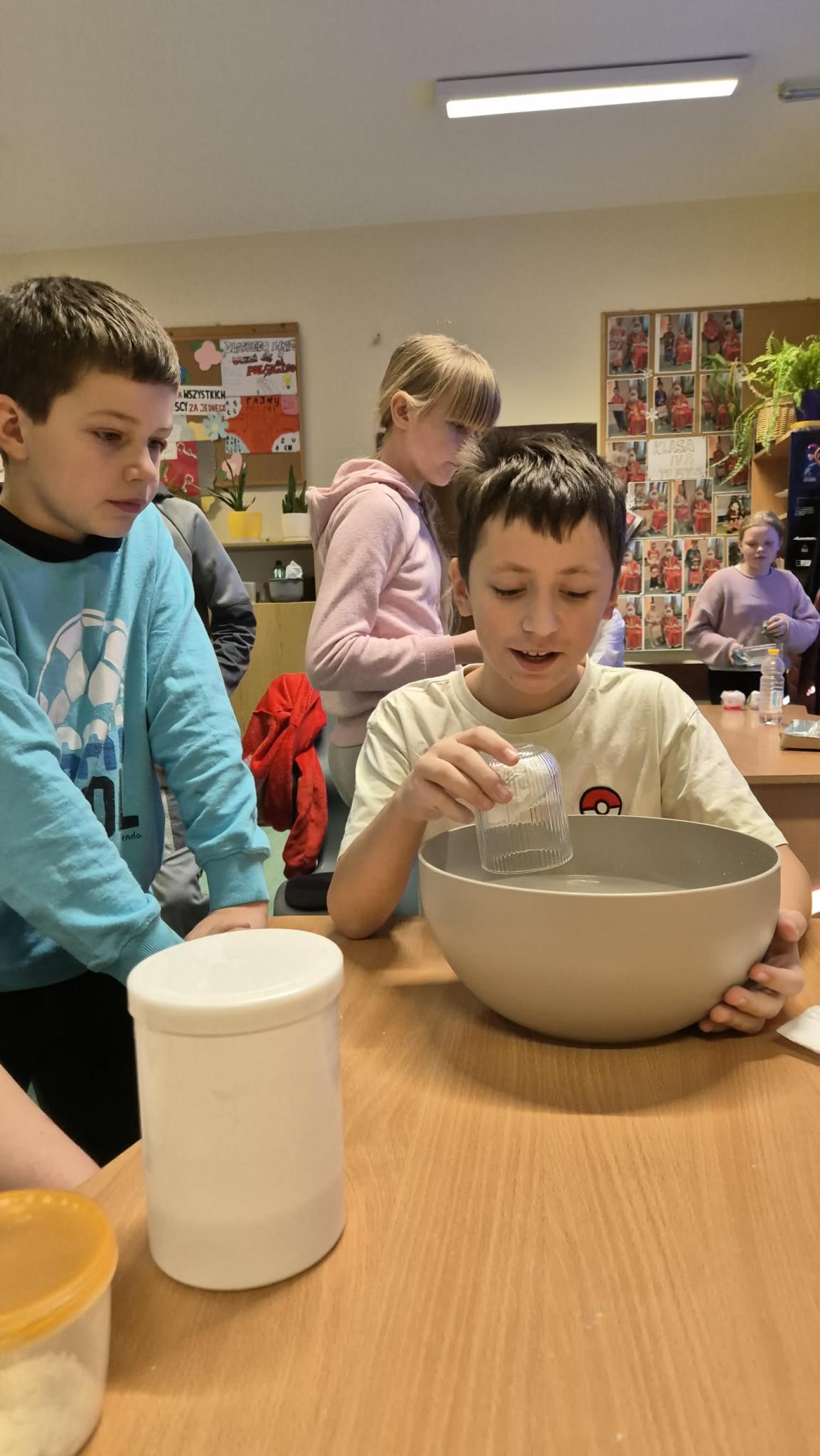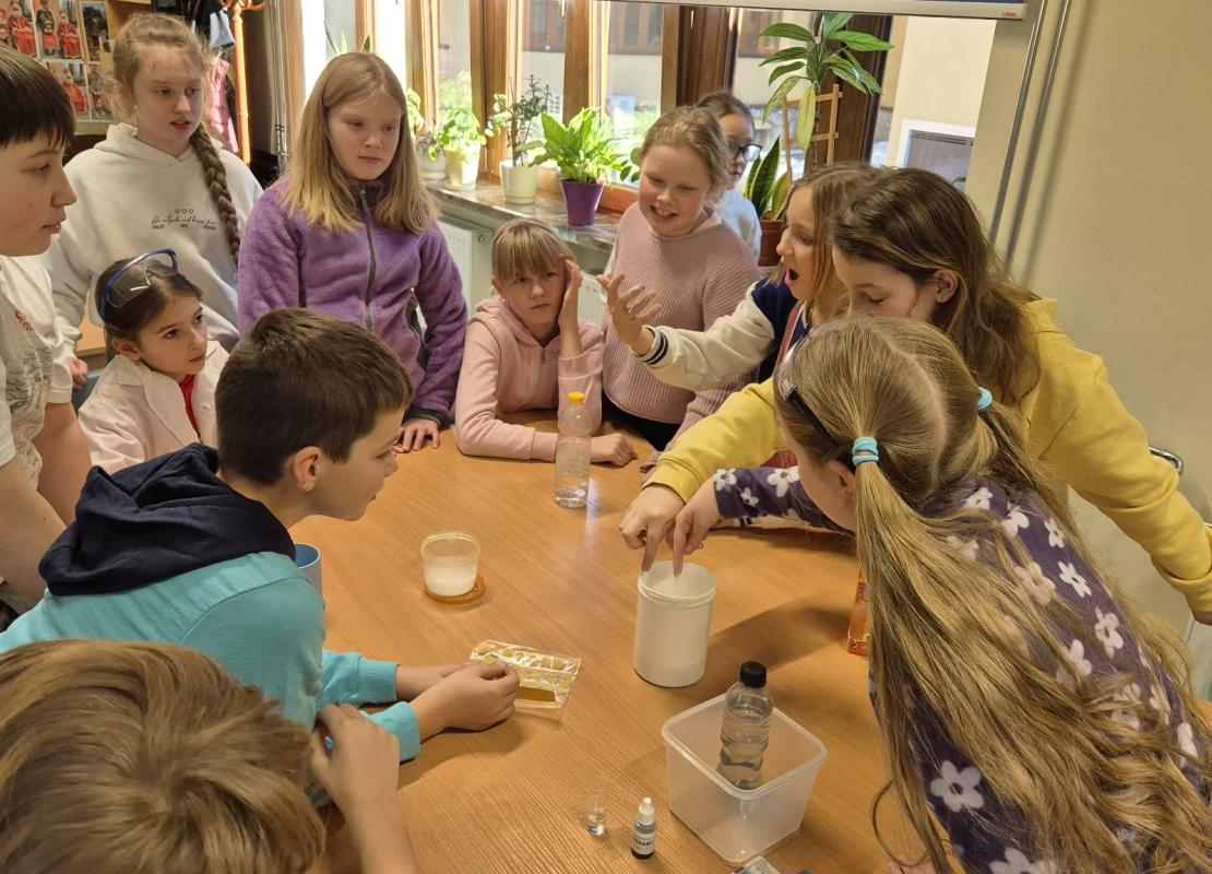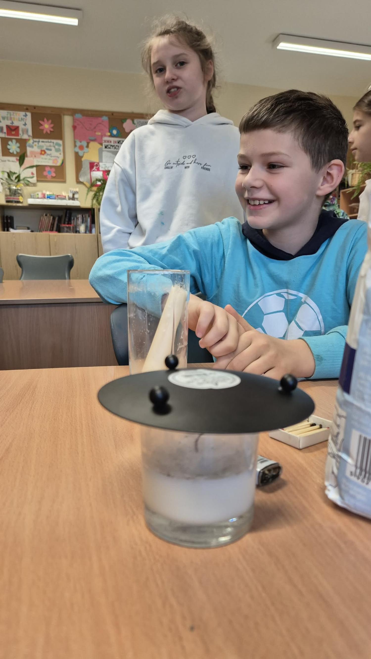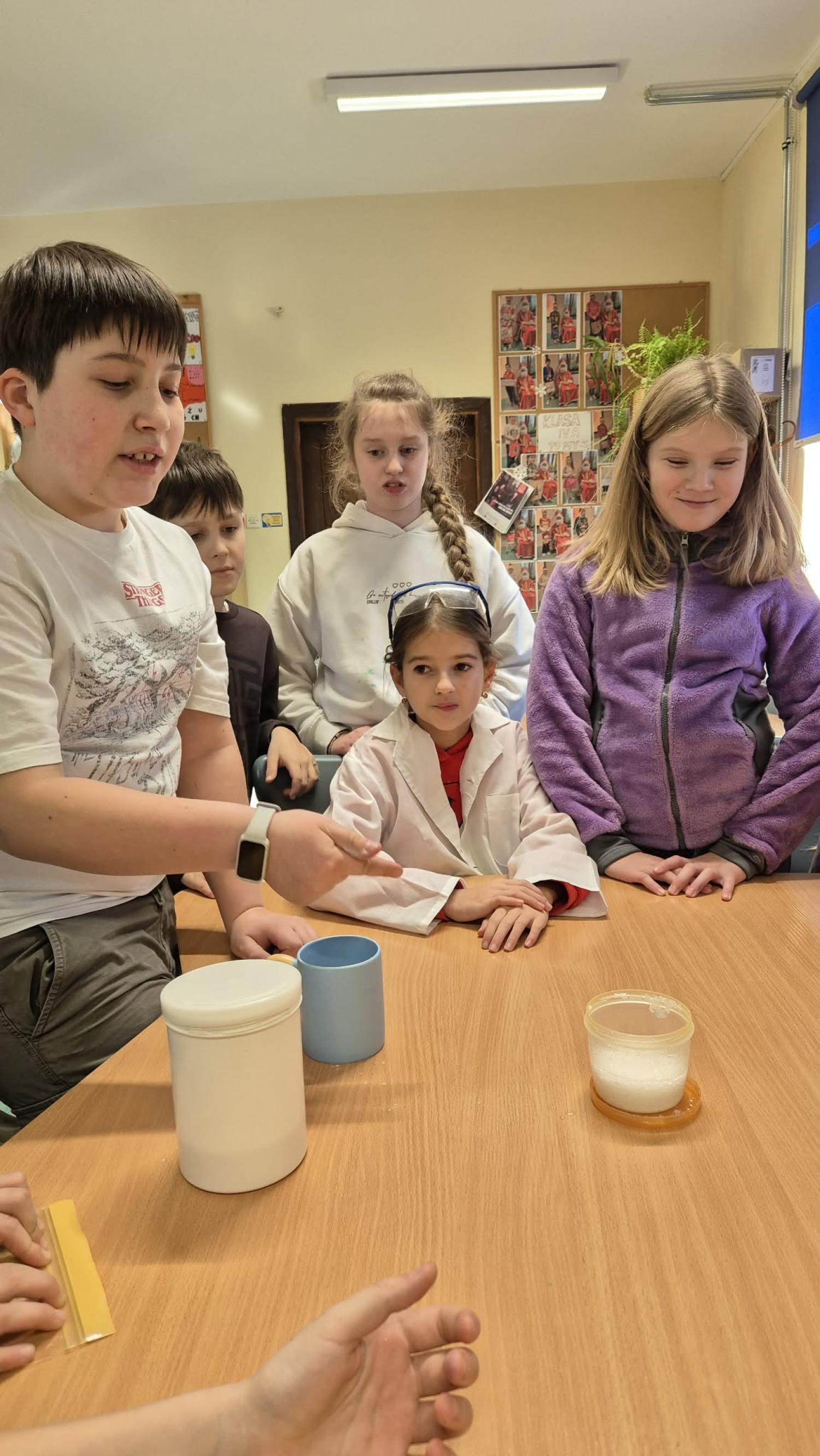 Czwartoklasiści samodzielnie przygotowali w domu różnorodne doświadczenia, a następnie zaprezentowali je swoim koleżankom i kolegom w klasie. Wśród pokazów znalazły się m.in. eksperymenty z wodą i olejem, wybuchający wulkan z sody i octu, hodowla kryształów soli, a także doświadczenia pokazujące właściwości powietrza i magnesów.