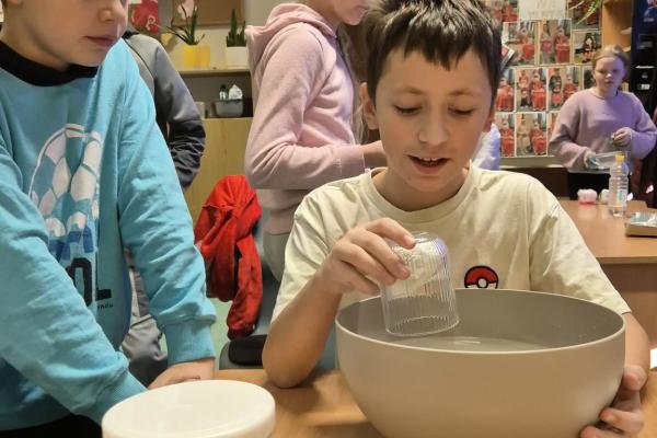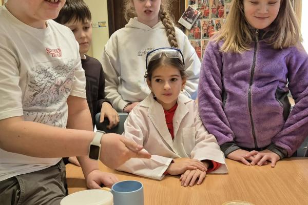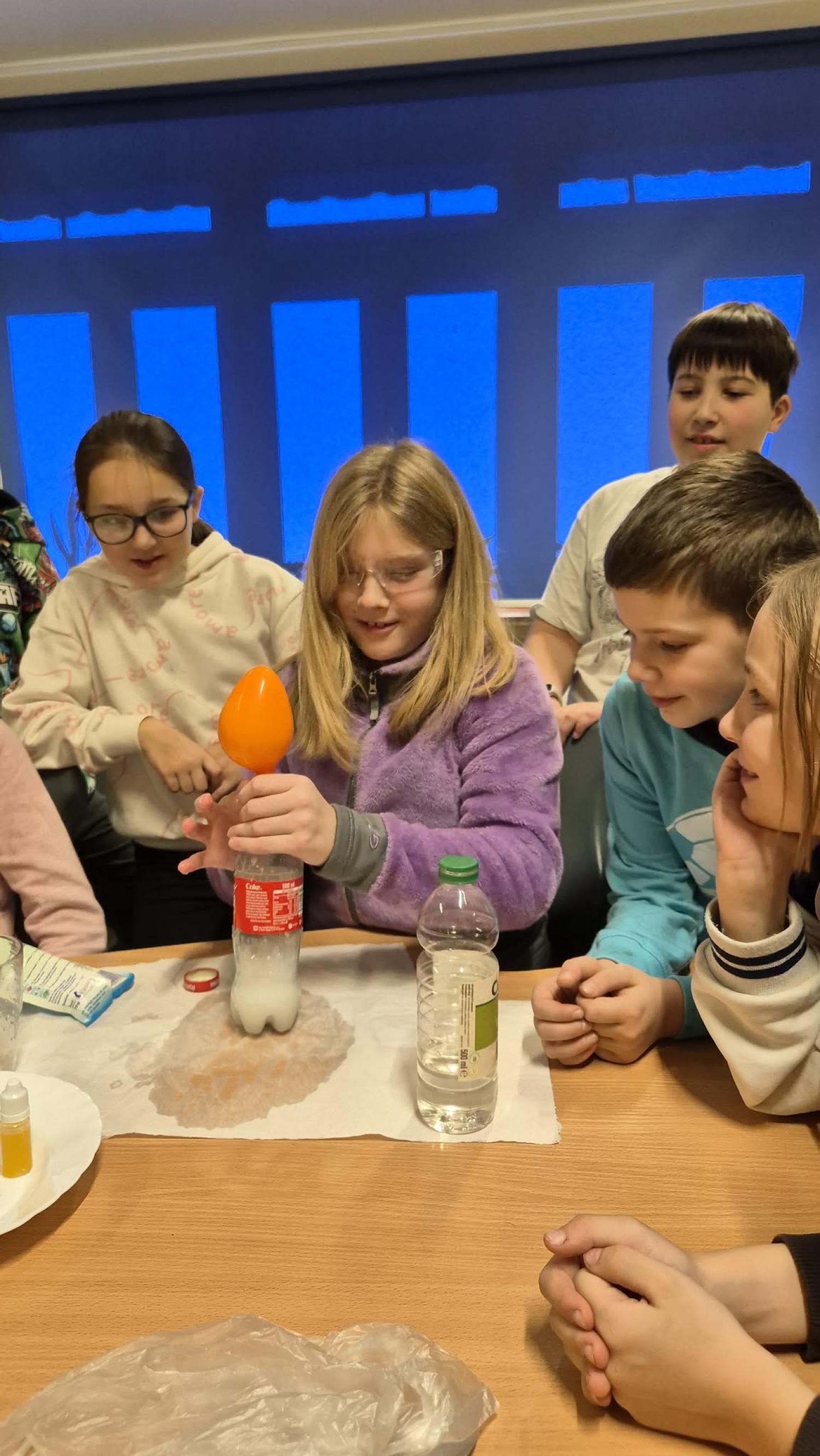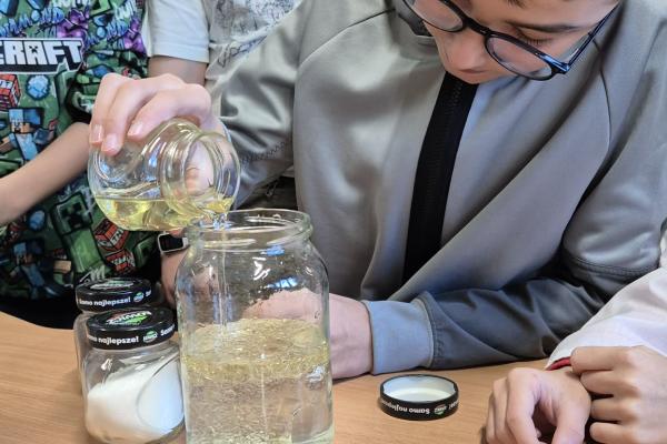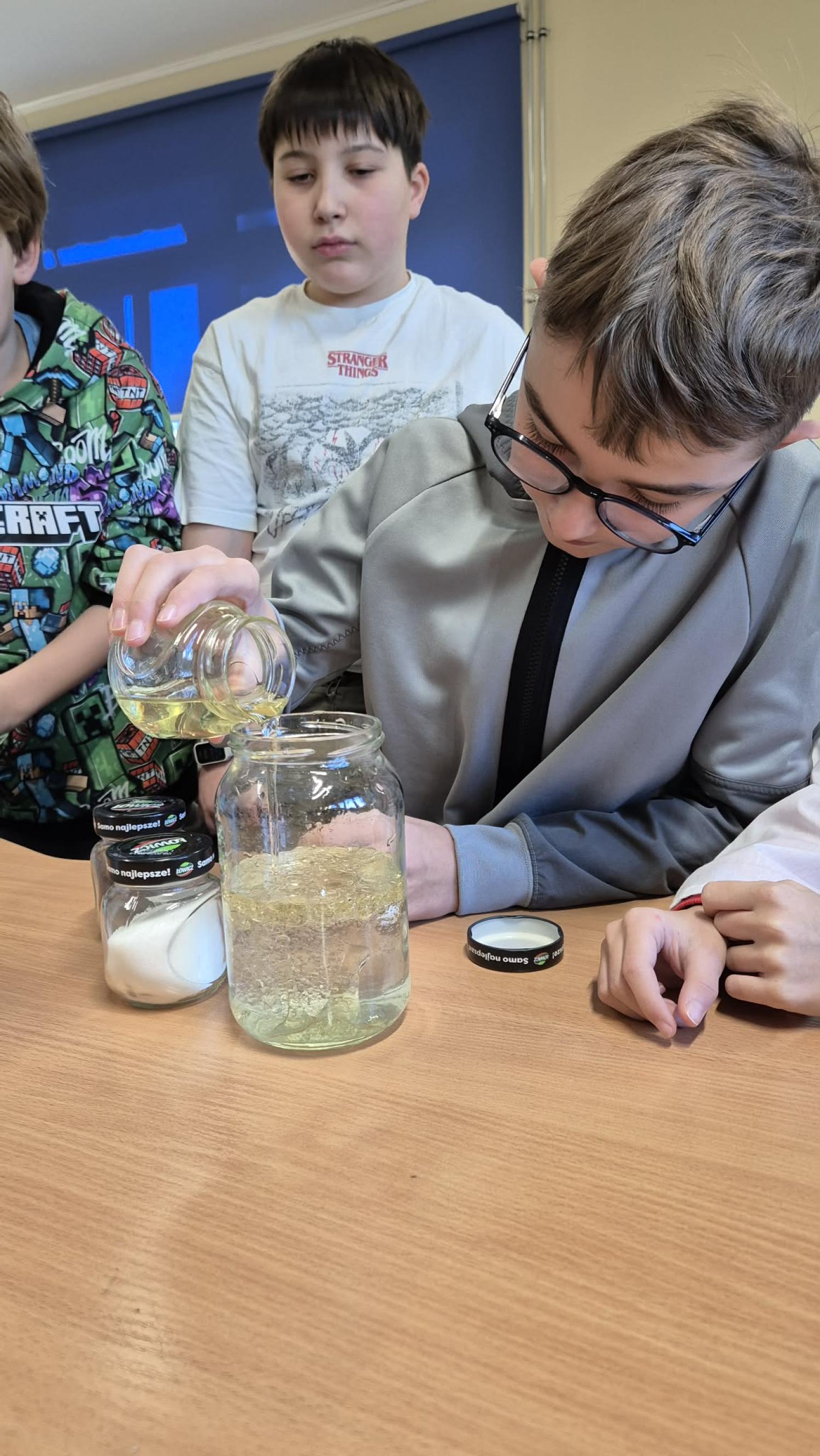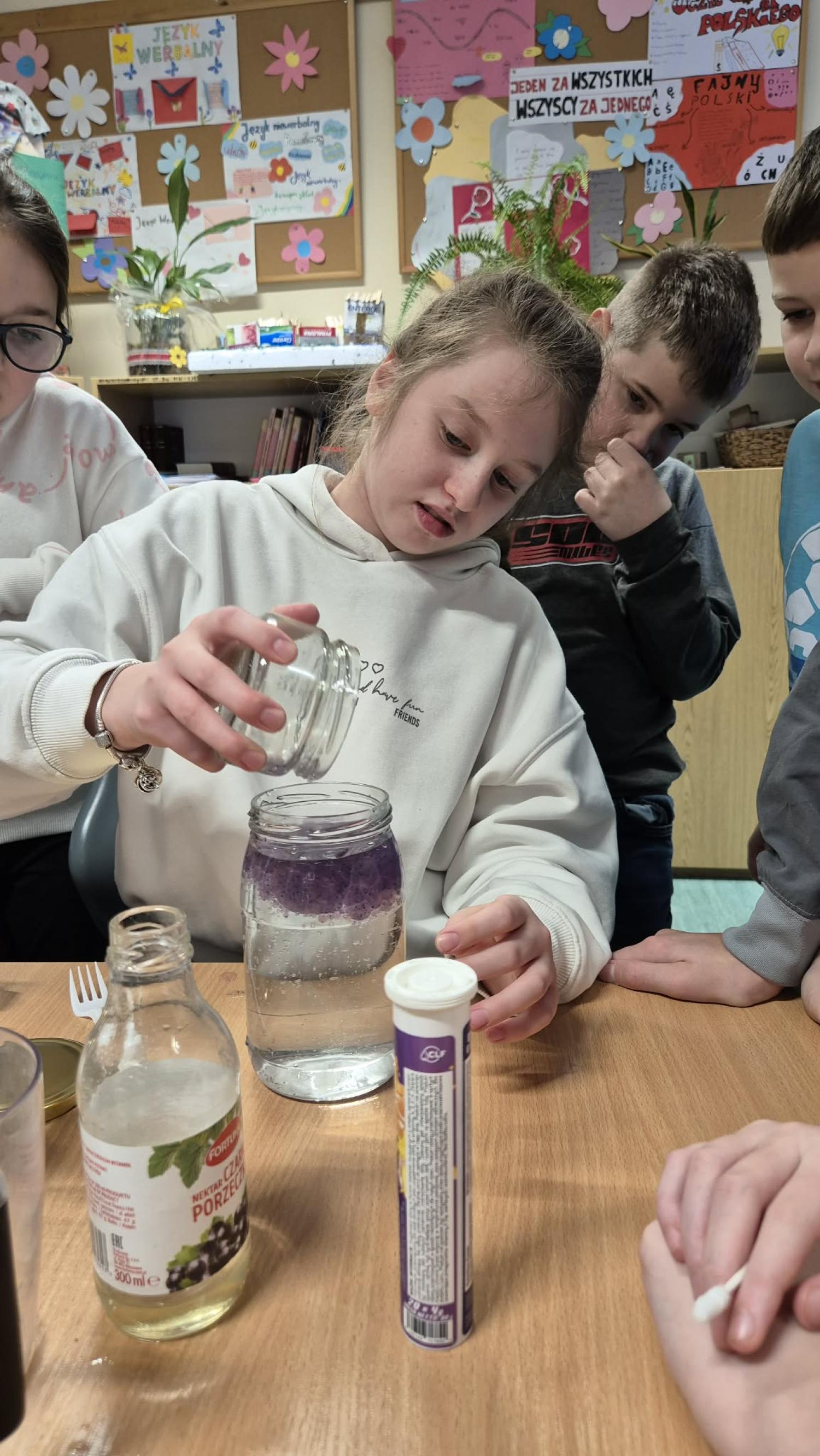 Czwartoklasiści samodzielnie przygotowali w domu różnorodne doświadczenia, a następnie zaprezentowali je swoim koleżankom i kolegom w klasie. Wśród pokazów znalazły się m.in. eksperymenty z wodą i olejem, wybuchający wulkan z sody i octu, hodowla kryształów soli, a także doświadczenia pokazujące właściwości powietrza i magnesów.