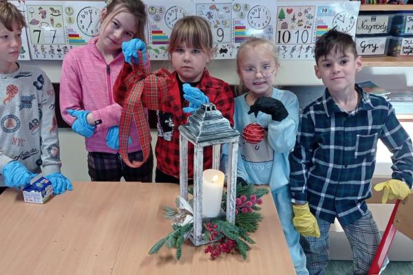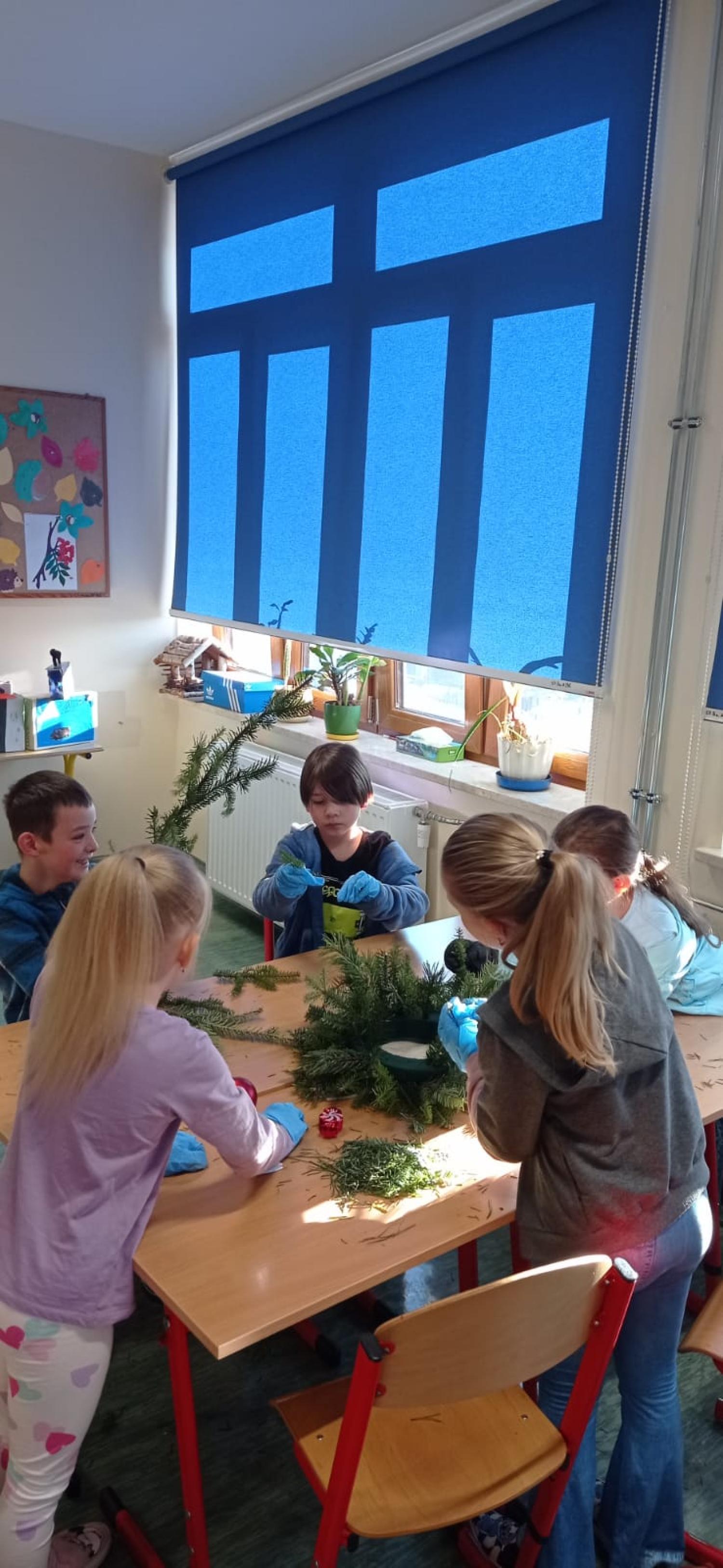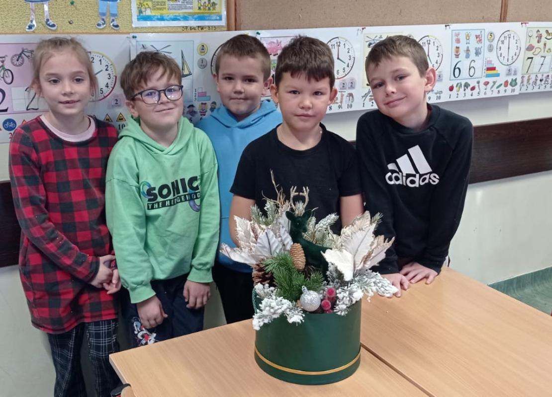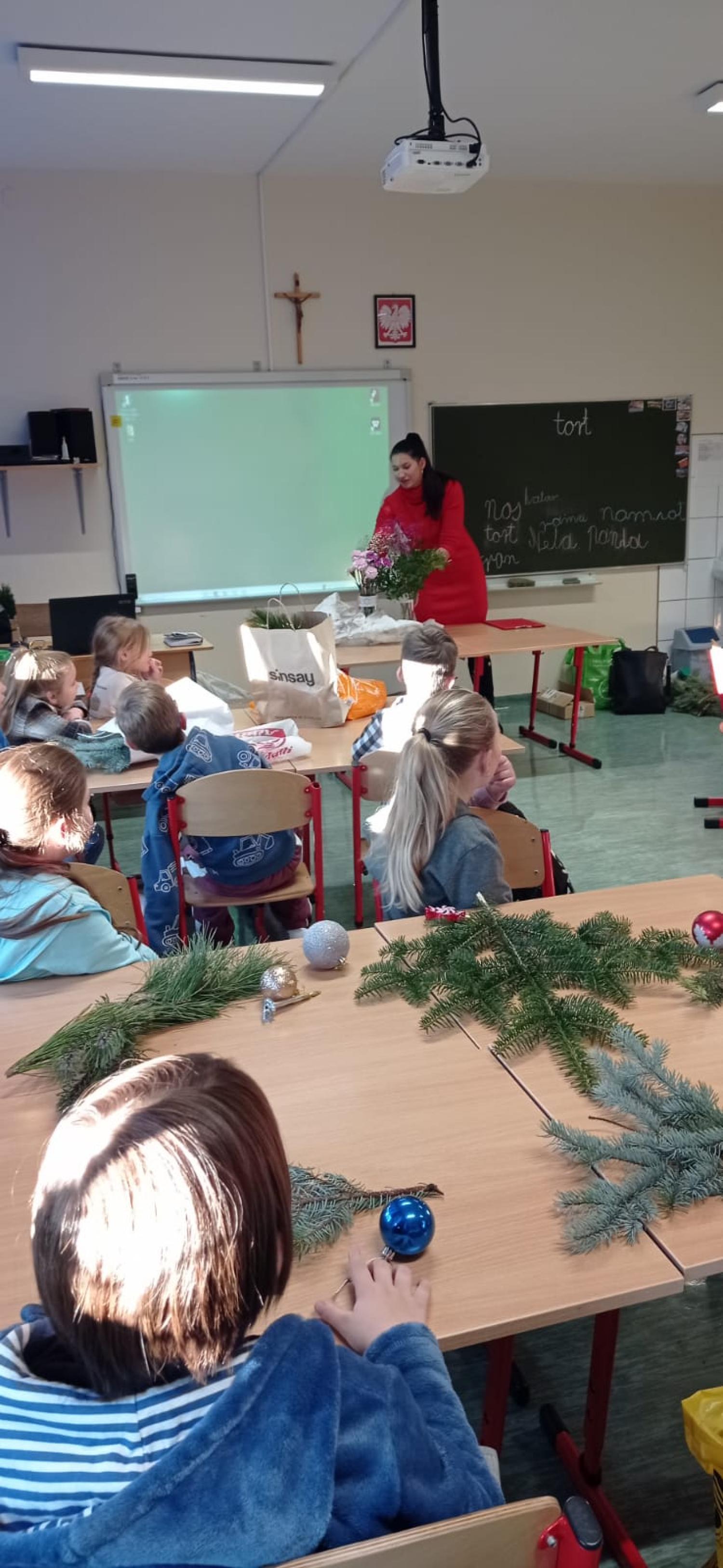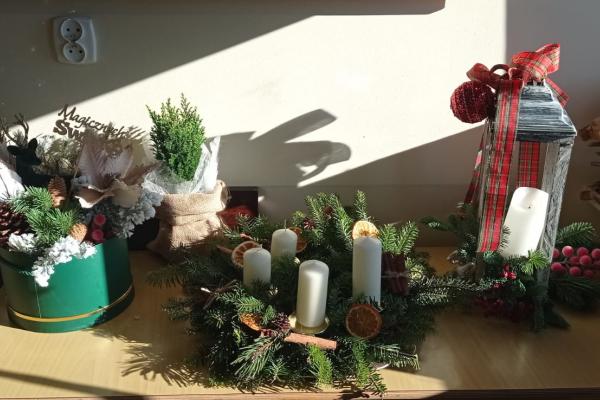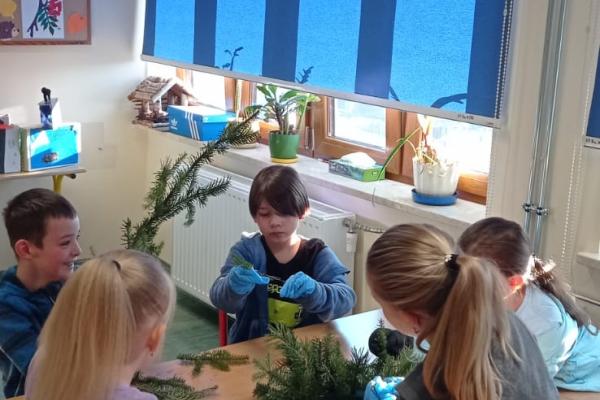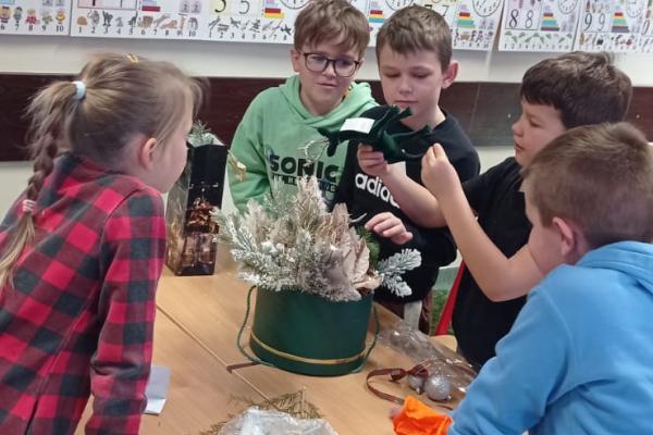 Pani Basia opowiedziała uczniom o swojej pracy, pasji do roślin oraz o tym, jak tworzy się różnorodne kompozycje kwiatowe. Największą atrakcją były warsztaty praktyczne. Pod okiem pani Basi uczniowie tworzyli świąteczne dekoracje, ucząc się dobierania elementów, układania gałązek i komponowania spójnych ozdób.