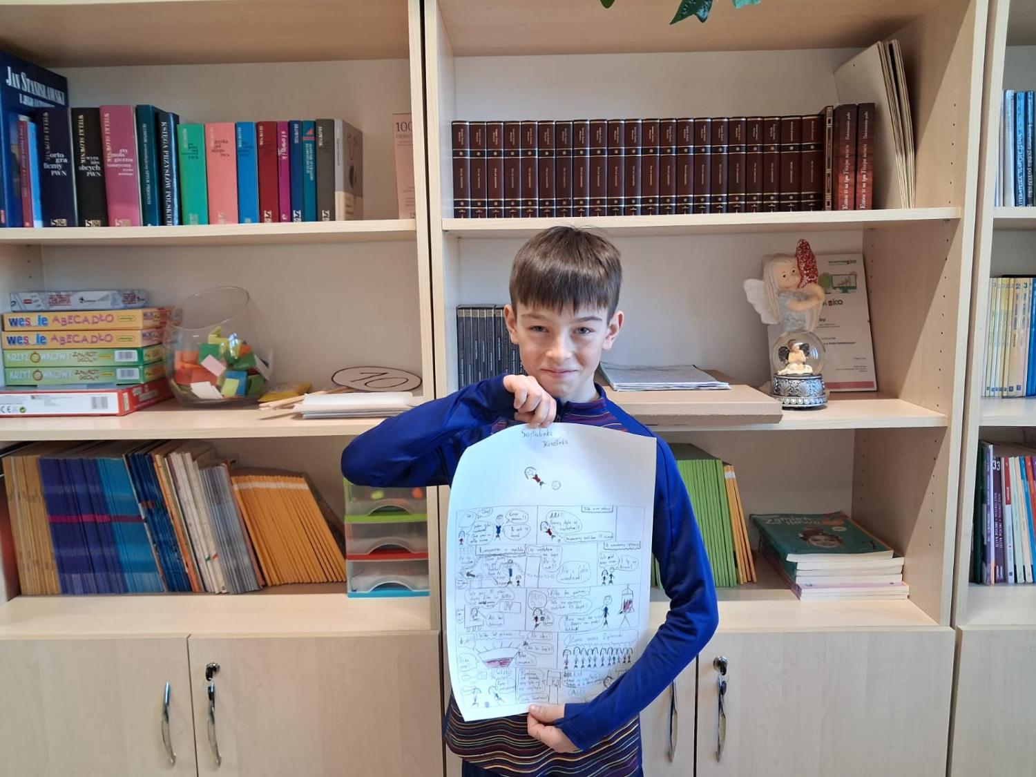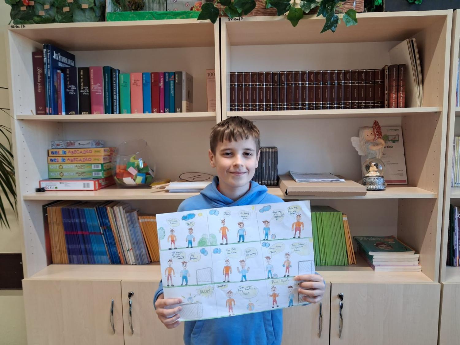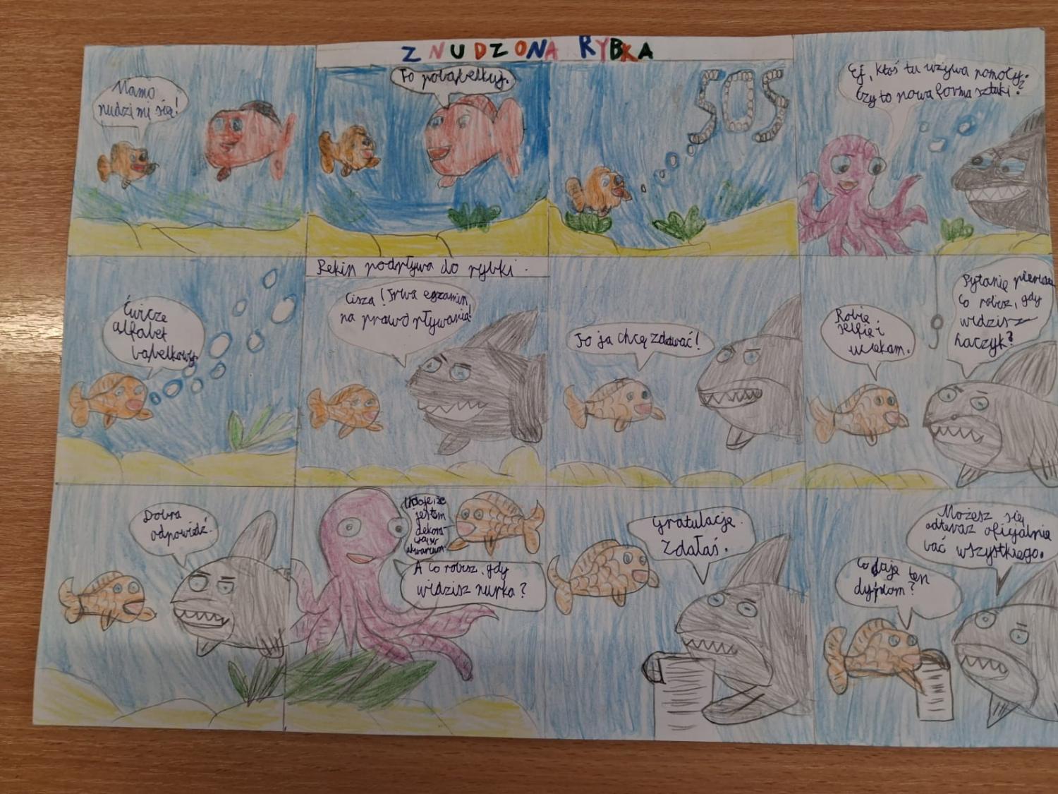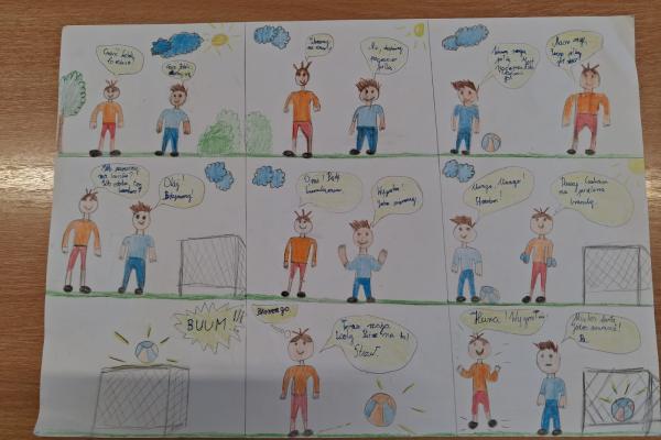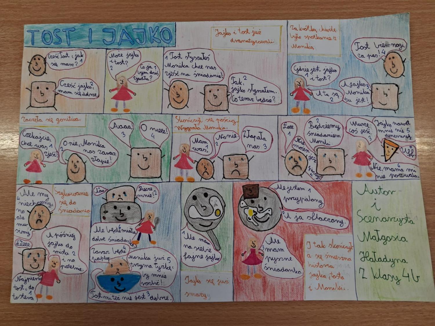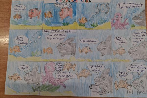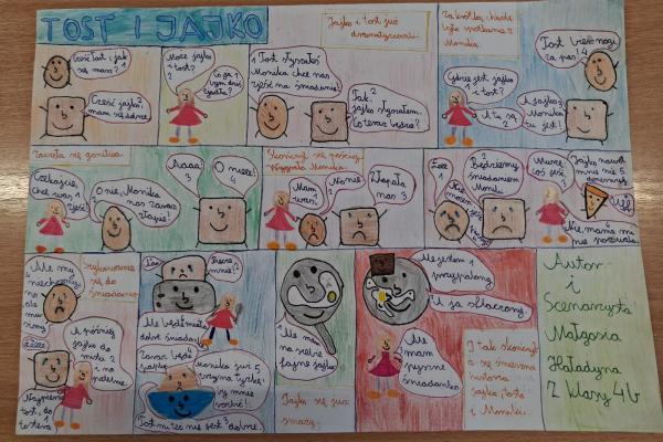 Podczas zajęć uczniowie mieli okazję wcielić się w rolę twórców komiksów. Najpierw przypomnieli sobie charakterystyczne cechy tej formy literackiej, a następnie stworzyli własne historie w formie komiksu. Powstałe prace były bardzo pomysłowe – pojawiły się ciekawe postacie, zabawne dialogi oraz barwne ilustracje.